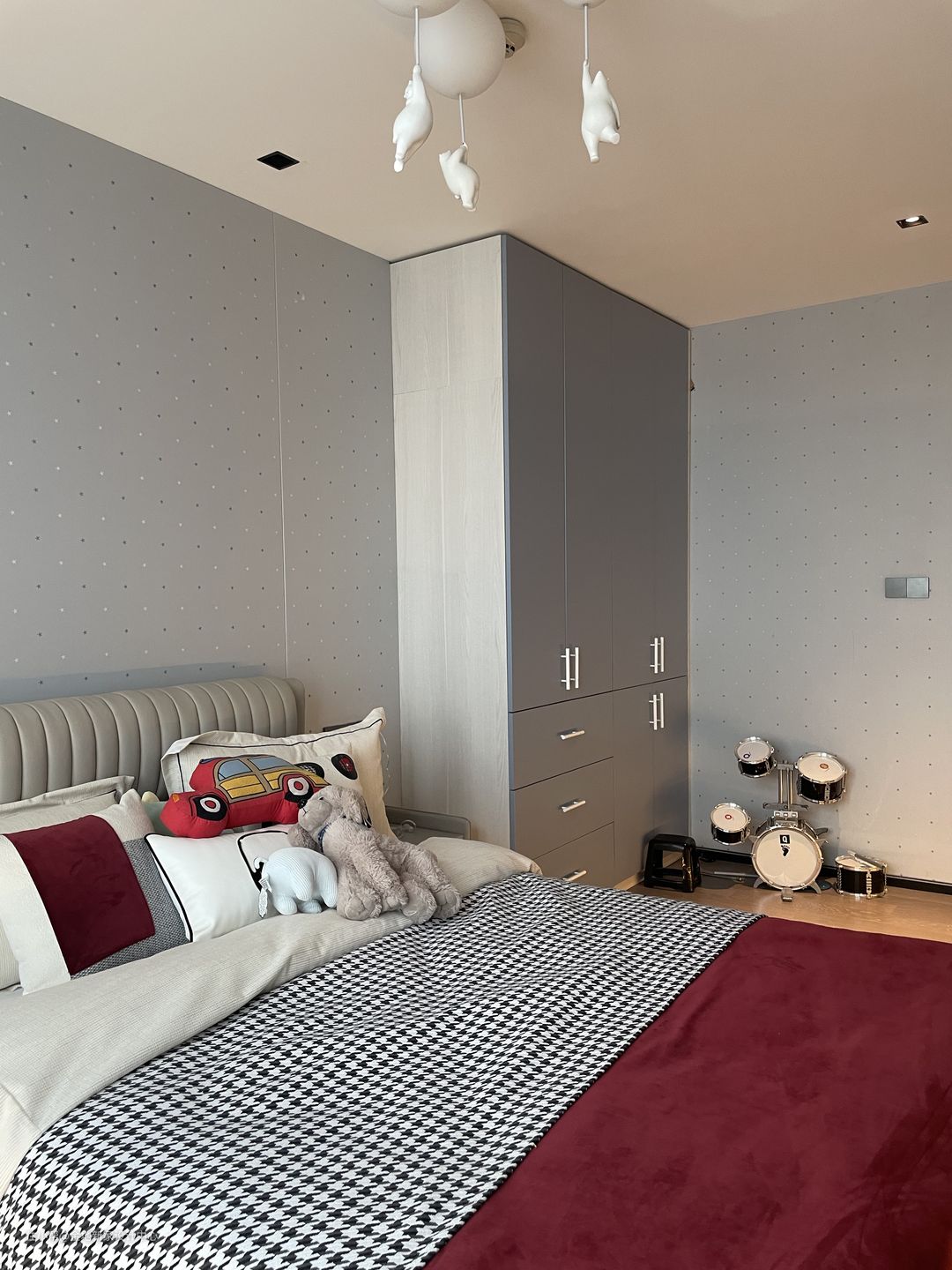 星星波点的床头背景墙布是小男孩自己挑选的,也正好能给简约的房间里带来一丝趣味。