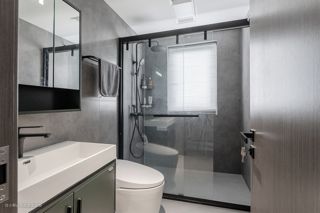 公卫,灰色成为打造卫生间的关键,墙地面通铺一体式的灰色瓷砖,简单大气不过时,也不易产生视觉疲劳。 淋浴区用了玻璃门做隔断,做到有效的干湿分离,而森林绿的浴柜则是这个卫生间的点睛之笔。在一片深色调的空间里,用非常小清新的色彩做点缀,彰显年轻时尚的活力感。