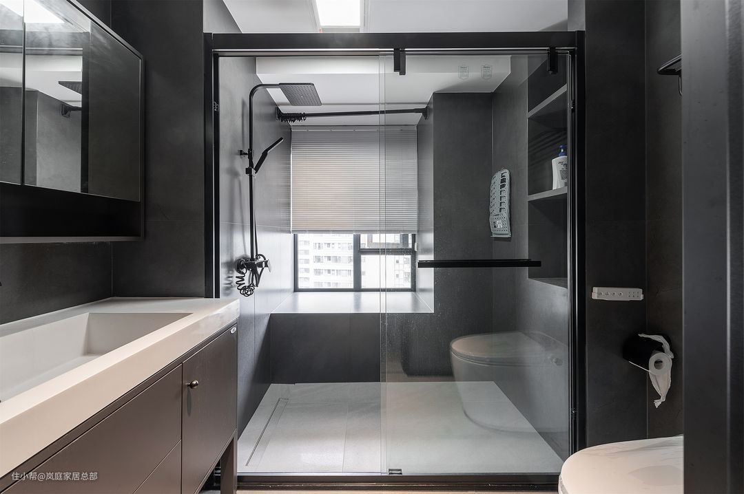 主卫则更沉稳一些,因为面积较大,户型跟公卫不一样,偏向于正方形,所以功能区的布局跟公卫有一定区别。 同样选择了钢化玻璃门做淋浴区的隔断,确保做好干湿分离和防水。在储物空间的设计上,设计师选择在淋浴区的墙面做了壁龛增加收纳,比传统置物架看上去更简洁,跟空间融为一体,颜值更高。