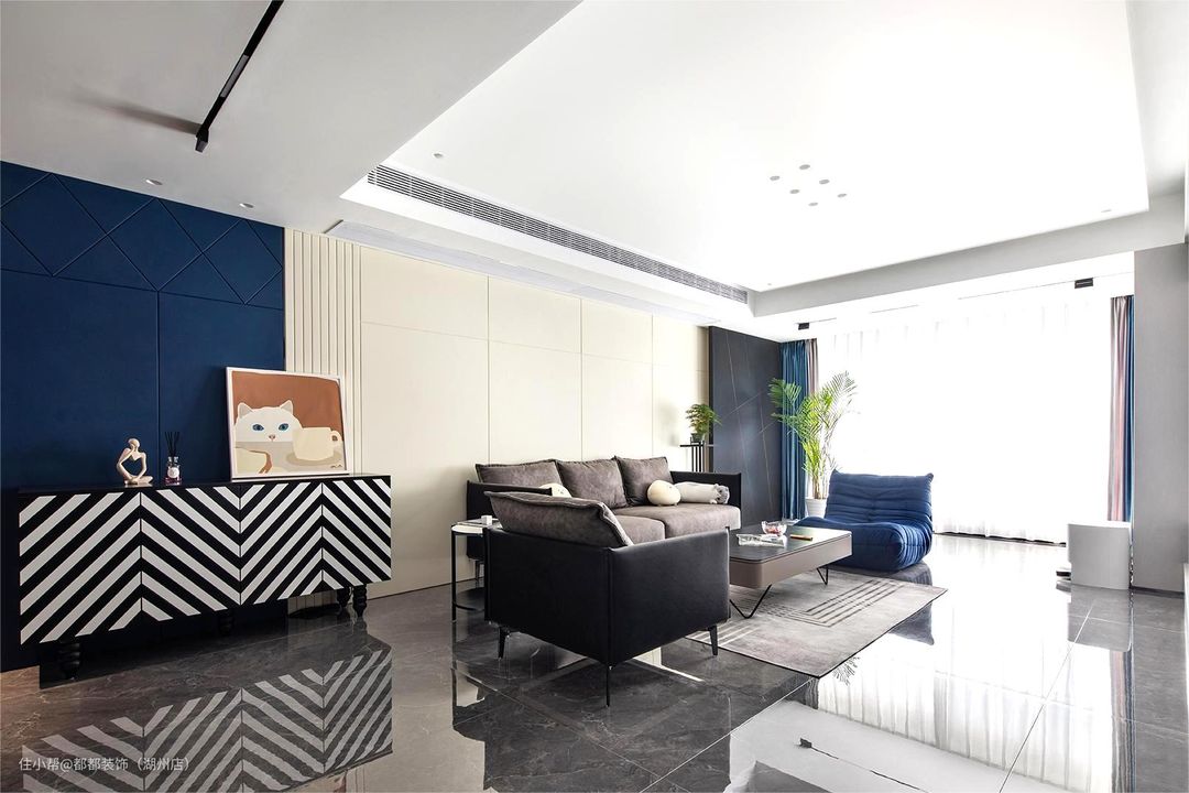 在蓝色背景下沙放置斑马纹边柜,莫兰迪橙的小猫装饰画和小人摆件点缀其中,整体构图和配色都十分讲究,各种物体几何轮廓多元、自由,打造摩登时尚的独特氛围。