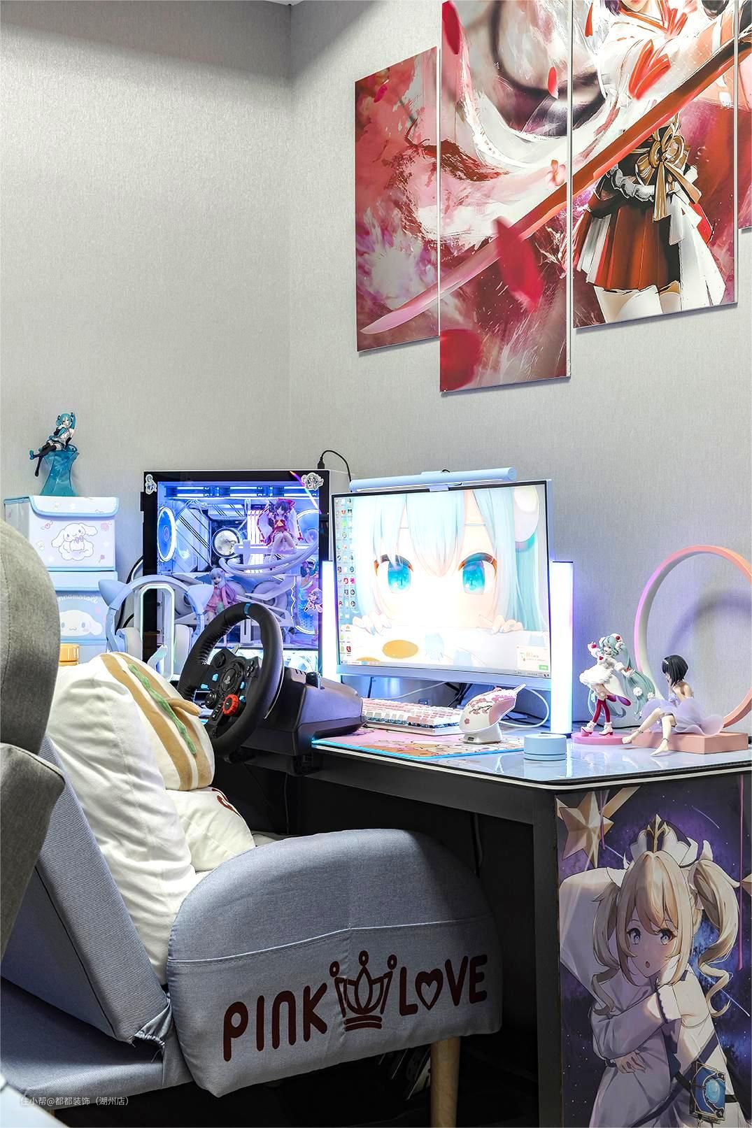 集游戏、展示、休息于一体电竞房你见过吗?将原本的书房设计成电竞房,是家中一处能完全放松的空间,空间以紫色系的风格为主色调,霓虹的灯光营造出科技感十足的氛围,墙上铺贴各种游戏角色海报,简直就是电竞爱好者的梦中情房!