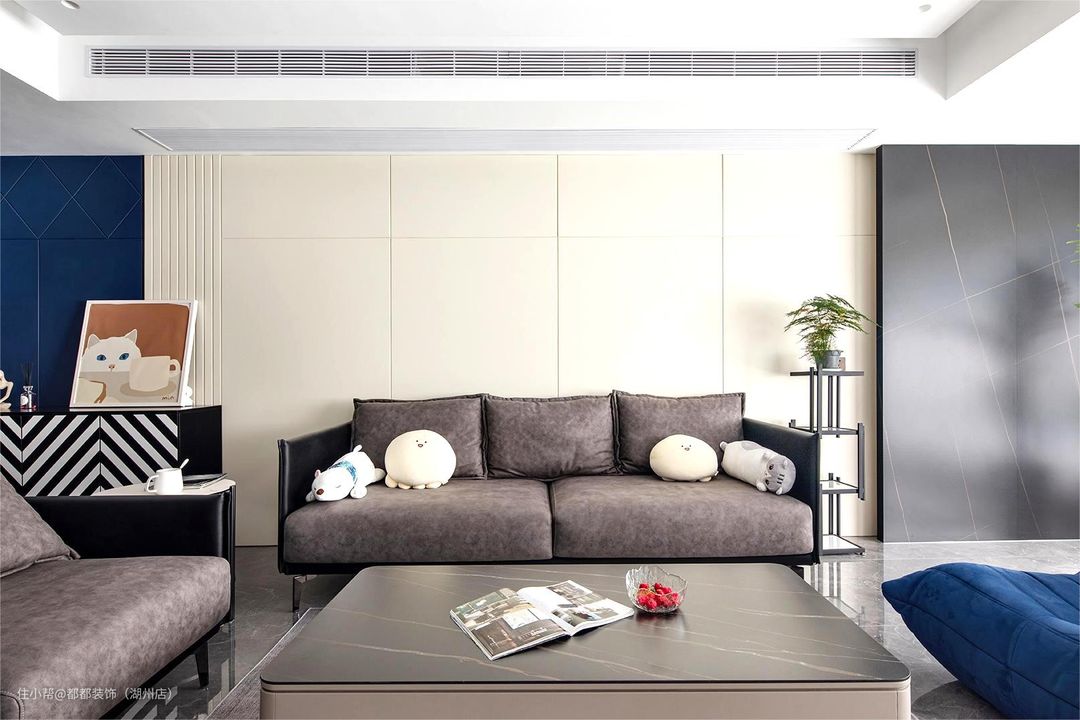 瓷砖地面搭配做旧灰色沙发和木质薄面茶几,米黄色背景墙削弱了灰色的清冷感,克莱因蓝懒人沙发为空间划出温柔的弧线,圆滚滚的玩偶抱枕灵动十足。