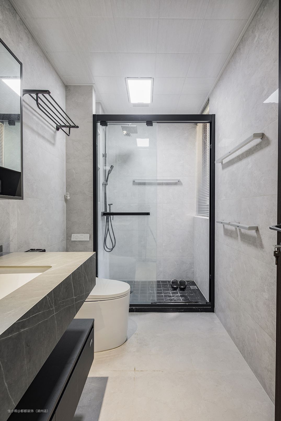 卫生间空间相对有限,但依旧实现了基础的三分离,墙地一体的通铺砖,让空间更显干净整洁,镜柜+悬空置物架的配置,洗漱台区域收纳进一步拉满,里侧则是马桶区及洗浴区,靠墙置物架的设计,一些随身物品及洗浴用具都能妥善安放。