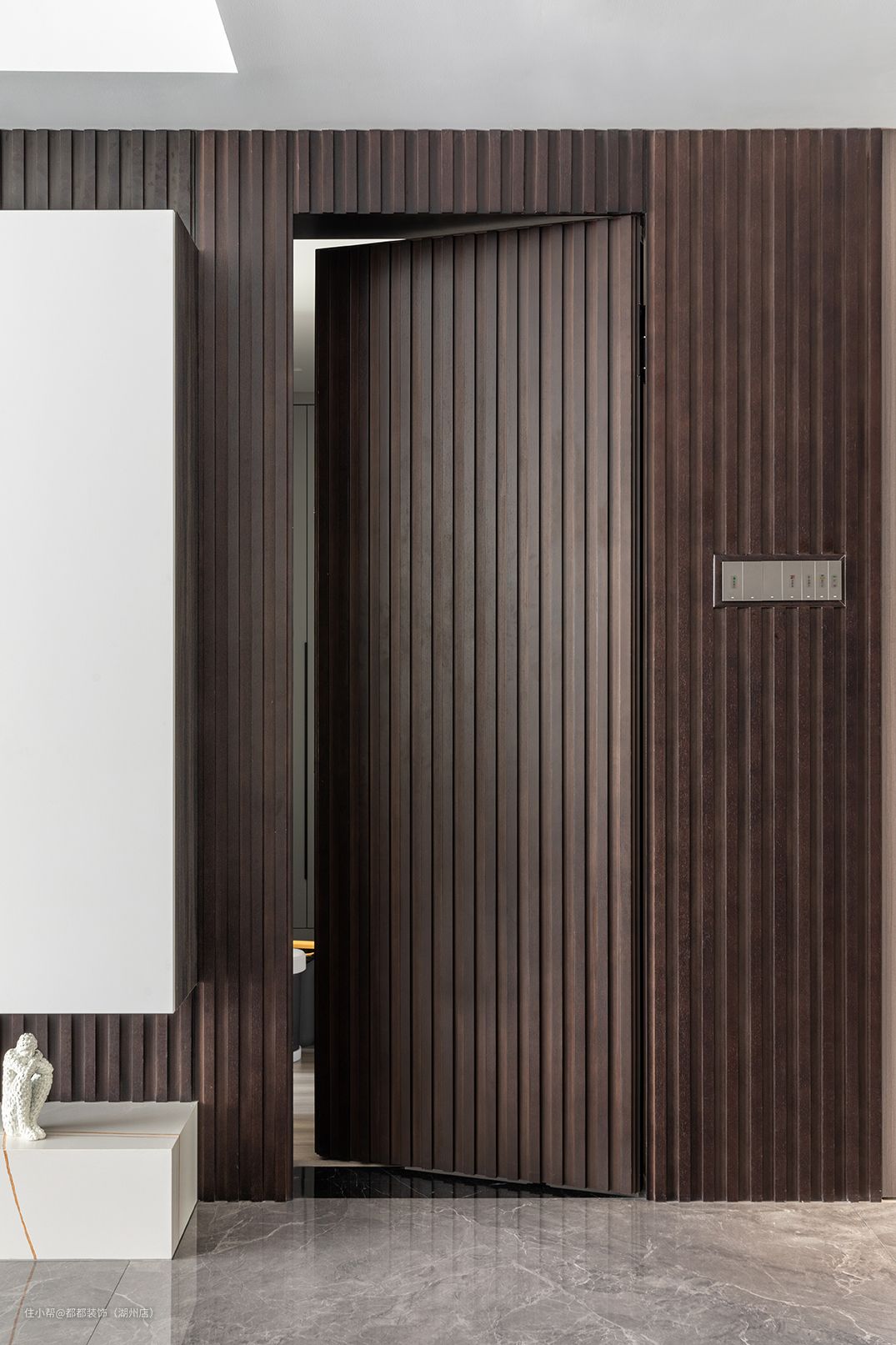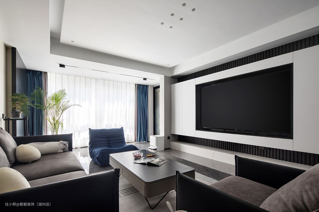 电视背景墙线条感十足,回字形设计整个空间视觉感受平整舒适,白色柜体配合着黑色格栅,经典cp永不过时,地柜采用了大理石材质,让电视背景墙的层次更分明,也使空间更有年轻和活力。