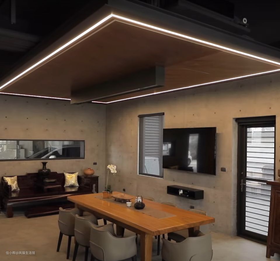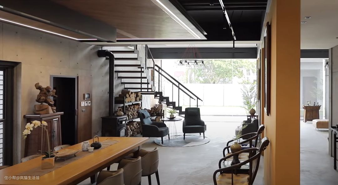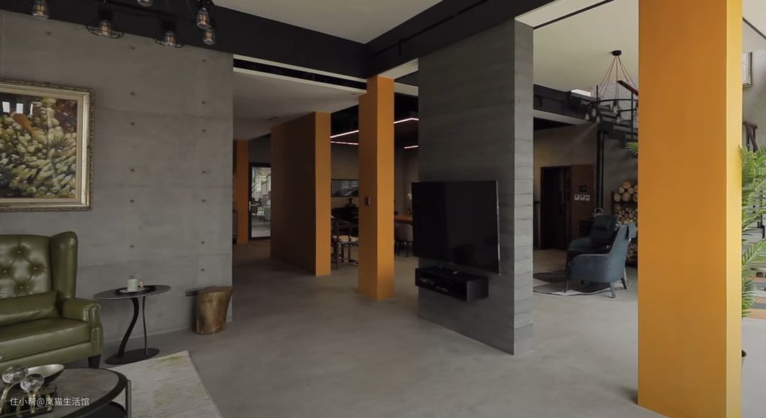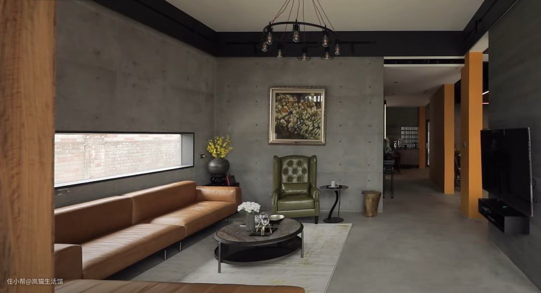 仿佛开了超级广角的客厅,本身就很宽敞,水泥质感的沙发背景墙面,中间掏空安装透明玻璃,让空间不会过度沉闷。 棕色的皮质沙发搭配双层的圆形茶几,精简也符合工业风的调性。本身是没有电视墙的,但是有观影需求就设计了一面竖墙安装电视,两侧留出空间便于走动。