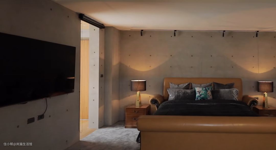 工业风的主卧,整体的墙面都是水泥质感,安装射灯调节光线,靠墙安装电视机。棕色真皮床,两侧摆放做旧的木质柜,符合工业风的基本配置。主卧还配有较大空间的卫浴室,安装手动拉帘,保证隐私。不使用时也保证了空间的通透。