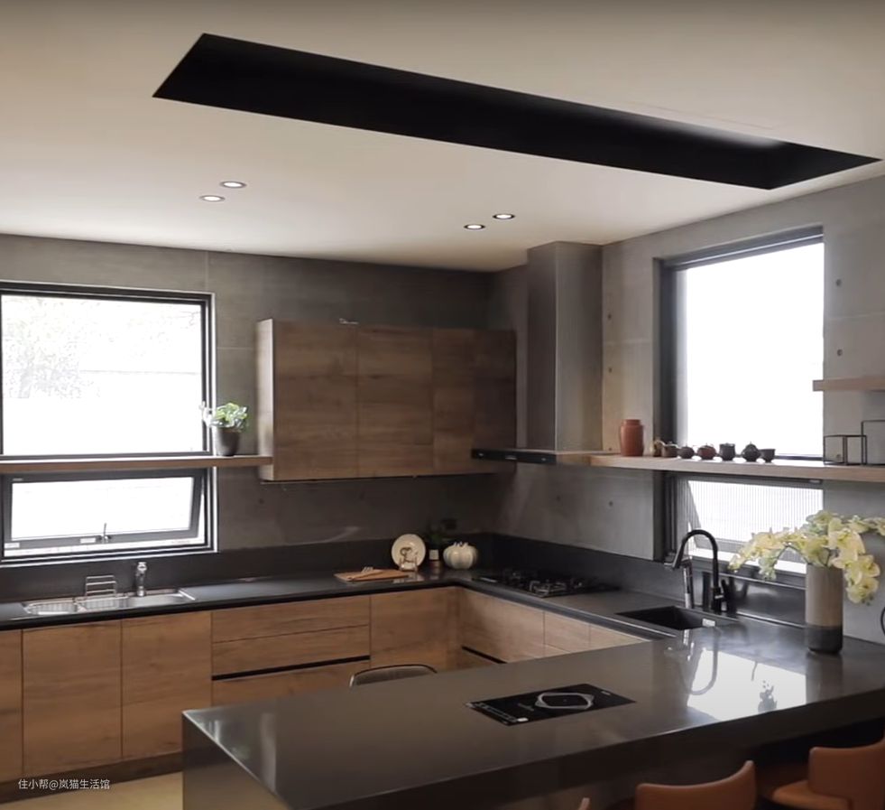 方正的厨房格局,可以容纳数人一起烹饪。亮面岩板材质做台面,木质柜体,精简设计,功能性强; 无主灯设计,灯具嵌入式;抽油烟机安装在靠窗的位置,保证空气流通。