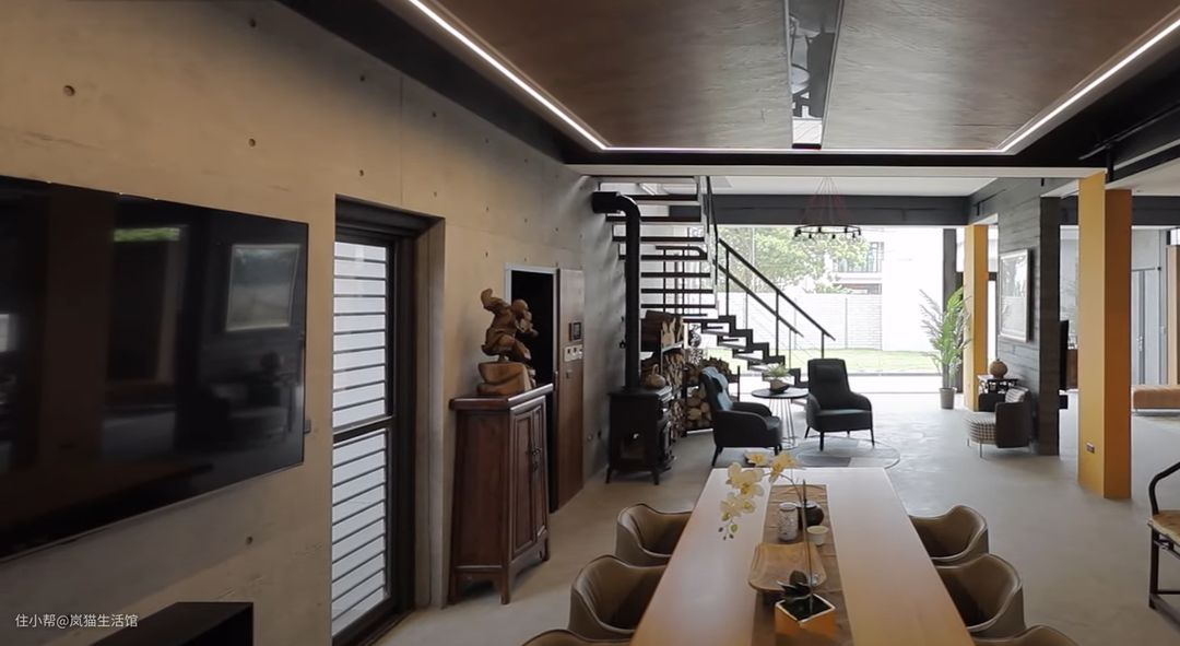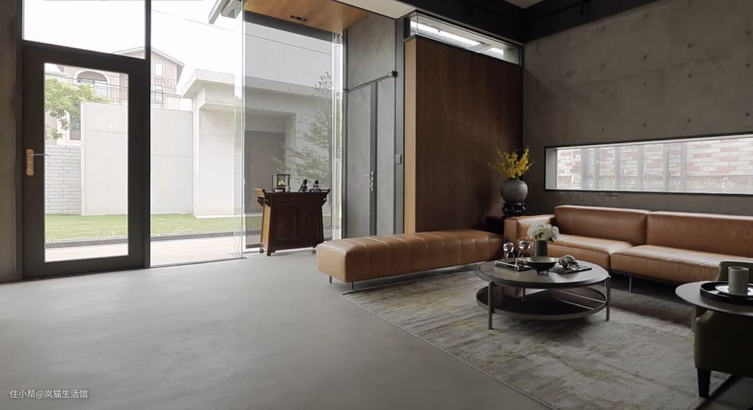 仿佛开了超级广角的客厅,本身就很宽敞,水泥质感的沙发背景墙面,中间掏空安装透明玻璃,让空间不会过度沉闷。 棕色的皮质沙发搭配双层的圆形茶几,精简也符合工业风的调性。本身是没有电视墙的,但是有观影需求就设计了一面竖墙安装电视,两侧留出空间便于走动。