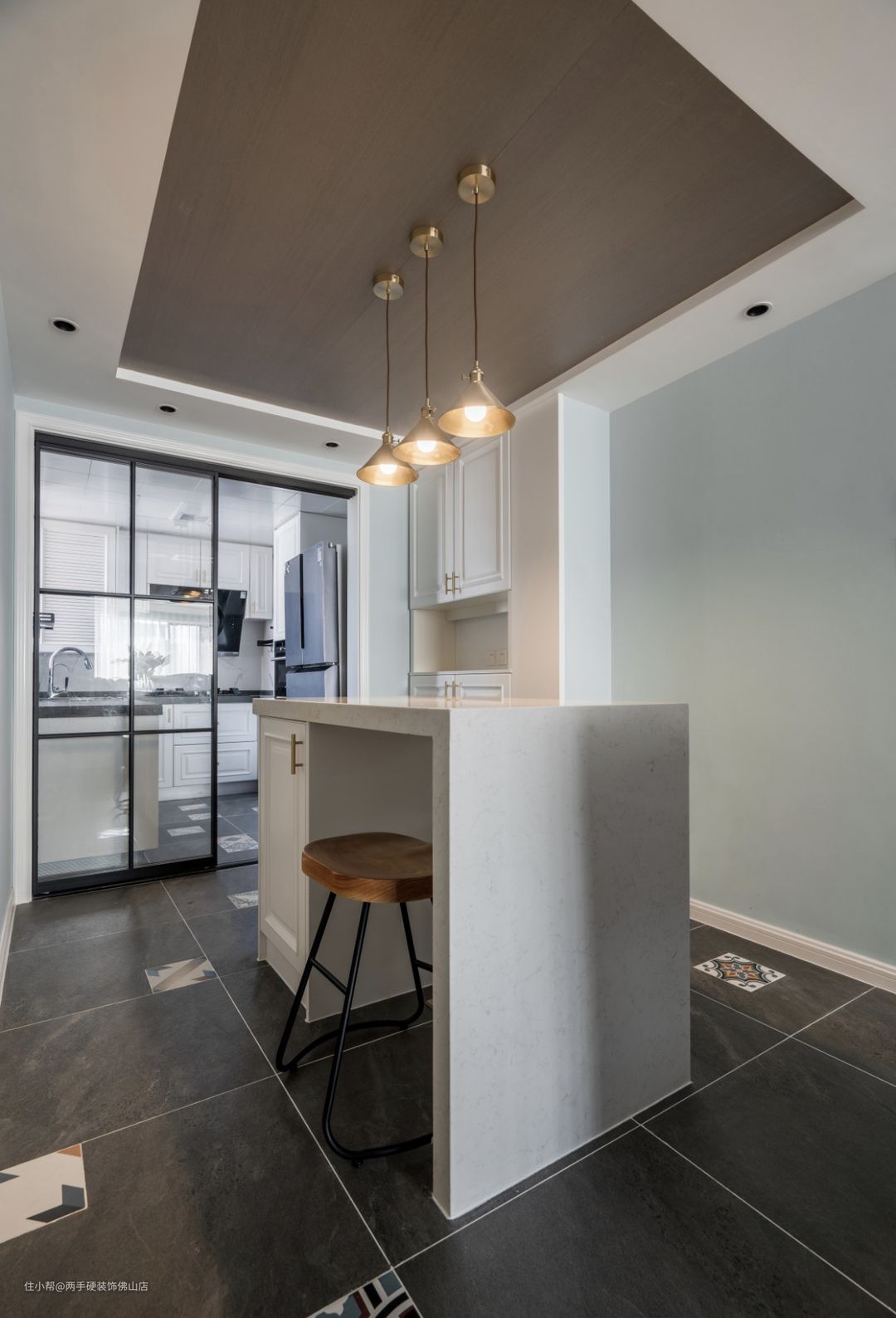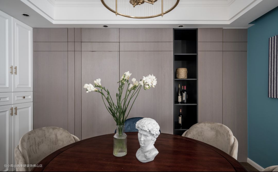 【改造说明】 1. 将原厨房的墙体拆掉,中厨面积缩小。在外面增加餐边柜,西厨吧台功能。由于餐厅离厨房有点距离,早餐就在西厨这边完成。 2. 客厅与餐厅位置互换,餐客厅的分割 使用了矮墙作为分割。客厅采光效果更好,同时客厅和休闲阳台可以有所互动,餐厅空间独立。 3. 餐厅主卧背景墙,设计隐形门,打造视觉空间层次错觉。 4. 全屋定制橱柜,最大程度利用空间,收纳简易。 5. 软装以轻奢美式风格为主,同时墙面使用了蓝绿色 类似 仙本那的海一般的颜色,打造简约下的轻奢品质感。