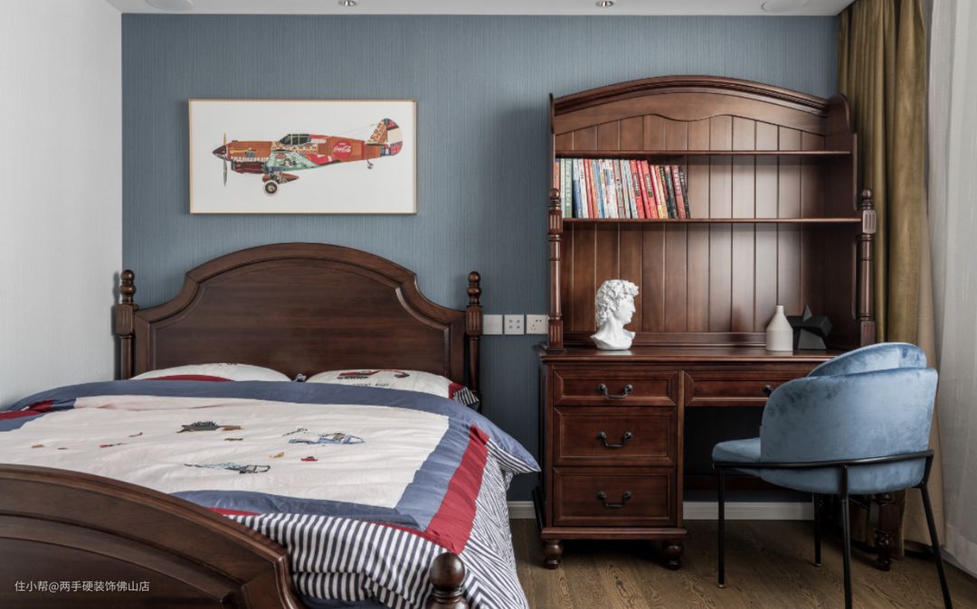 蓝色背景墙上挂着宝宝喜欢的飞机图画,在这个静谧的卧室里 慢慢成长。