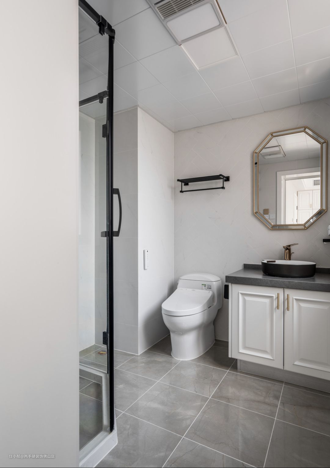 可能很多人会觉得这样的整洁状态是入住前的仪式感,但这其实是业主生活的常态,为数不多的卫浴用品都安安静静“躲”在不规则八角镜底下的橱柜中,以灰色为基调的大理石纹路墙地砖,也是亮点。