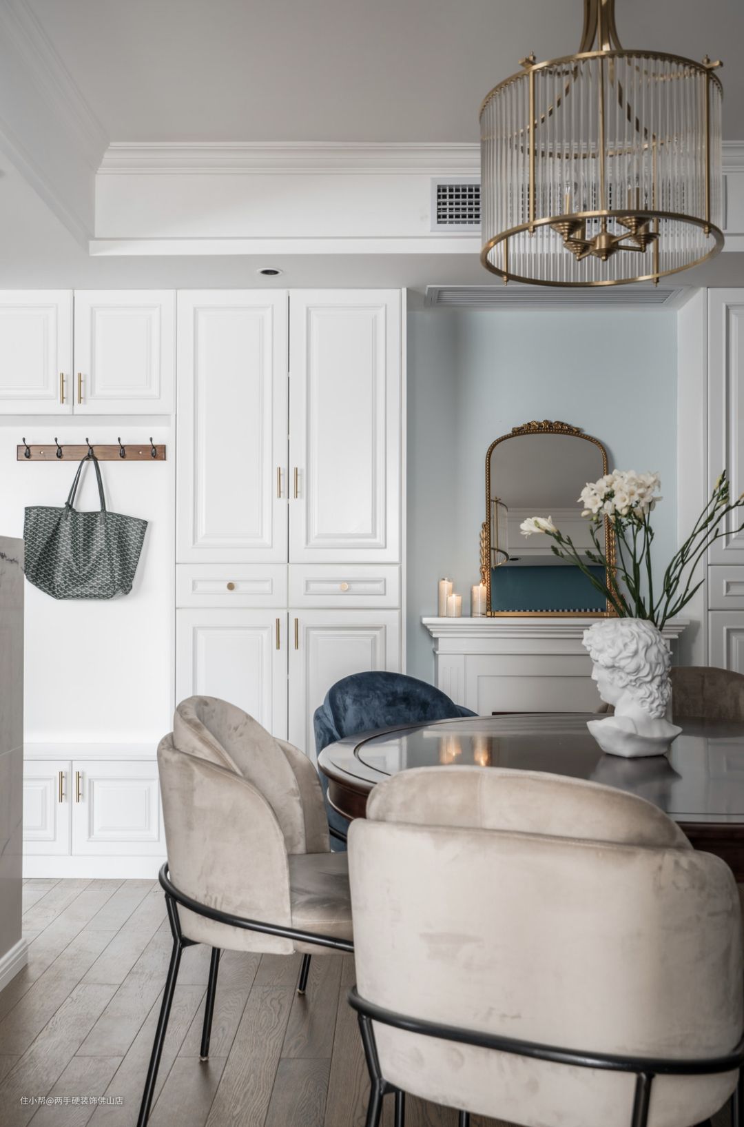进门的衣帽柜和餐边柜相结合,白色的柜门再加上金属色边框镜子默默扑捉着对面一家人用餐的幸福点滴,好似有些厚重的复古壁炉,也在全屋定制的白色橱柜映衬下显得不那么刻板,与西方的文化里的纯净融为一体。
