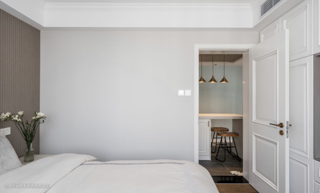 主卧在隐形门之后,空间不算很大 ,但有让人身心愉悦的宽幅窗,在这样的空间里,背景墙以饱和度很高的蓝绿色硬包,柜体门板全部为白色 整体舒适漂亮。