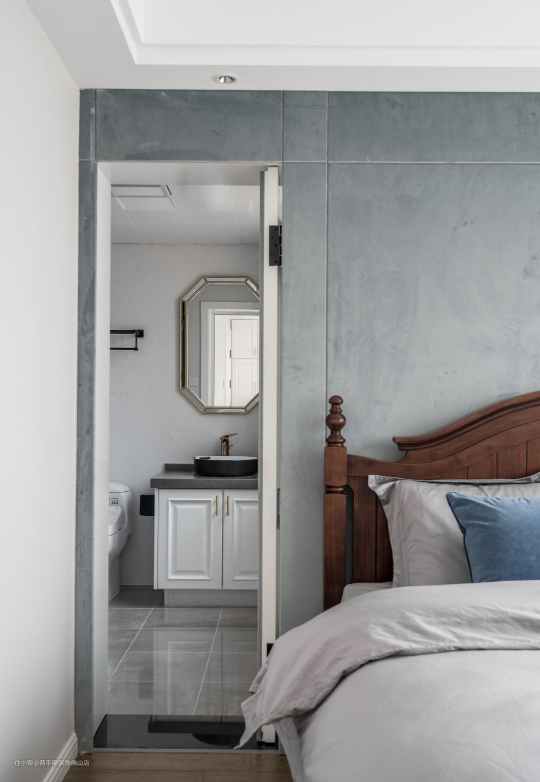 可能很多人会觉得这样的整洁状态是入住前的仪式感,但这其实是业主生活的常态,为数不多的卫浴用品都安安静静“躲”在不规则八角镜底下的橱柜中,以灰色为基调的大理石纹路墙地砖,也是亮点。