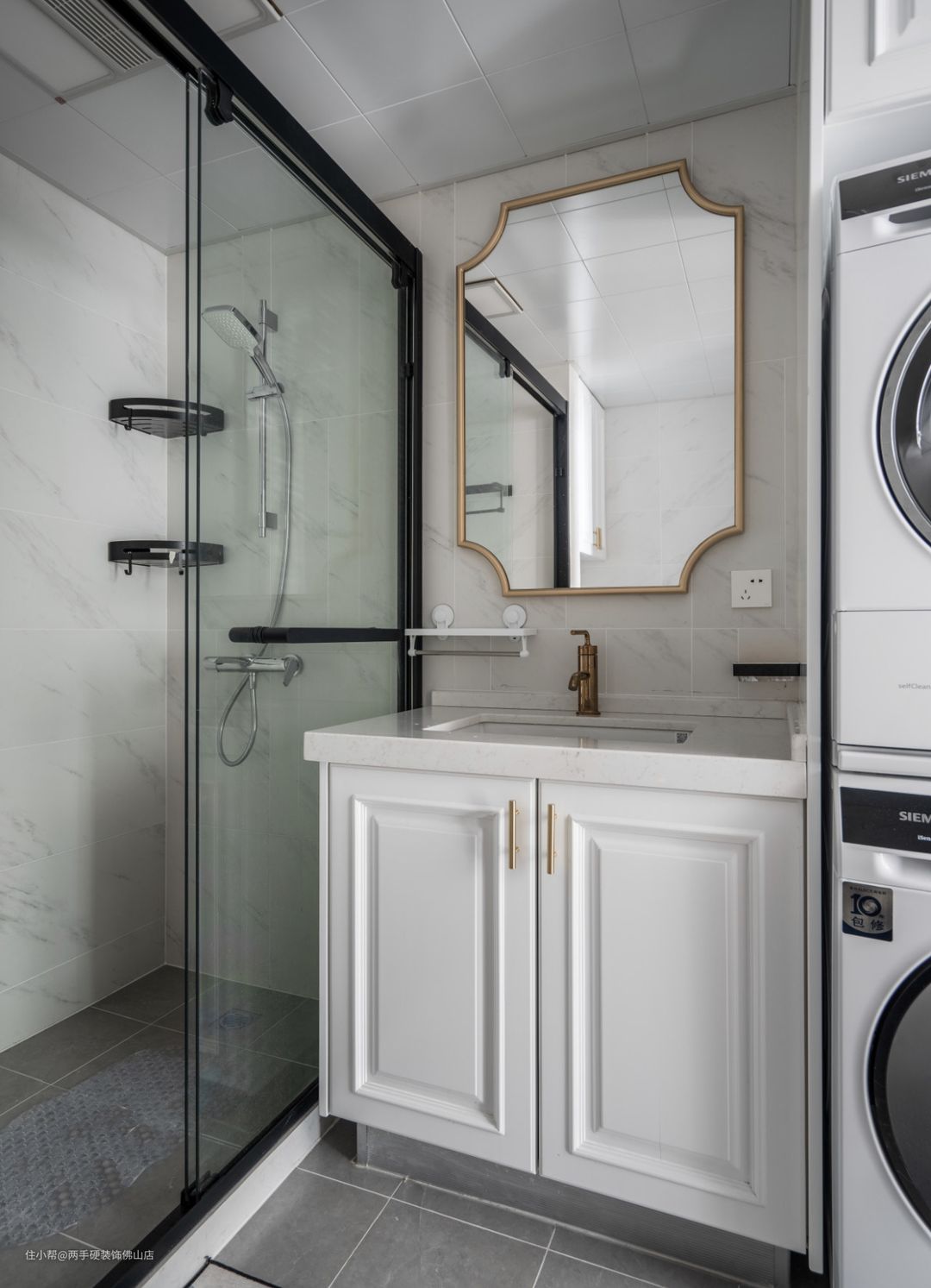 简约不简单,细节之处见精致,洗浴间采用当下流行的黑框玻璃门,这与盥洗水池还有挂壁颜色呼应,整体质感风格统一。