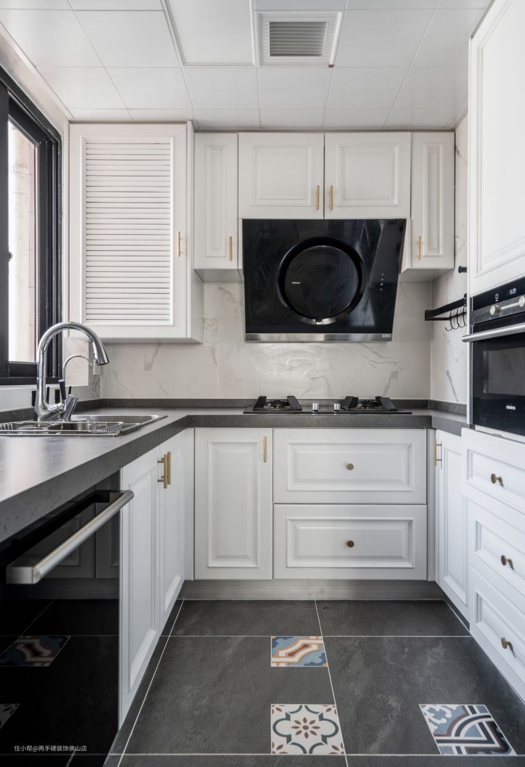 U型厨房有着充足的采光,整体全屋定制橱柜,让不大的空间有了足够多的收纳空间,足以容纳一家4口的餐饮食材、器皿。以大面积灰色瓷砖为主色调加上花砖作为点缀,时尚简洁。