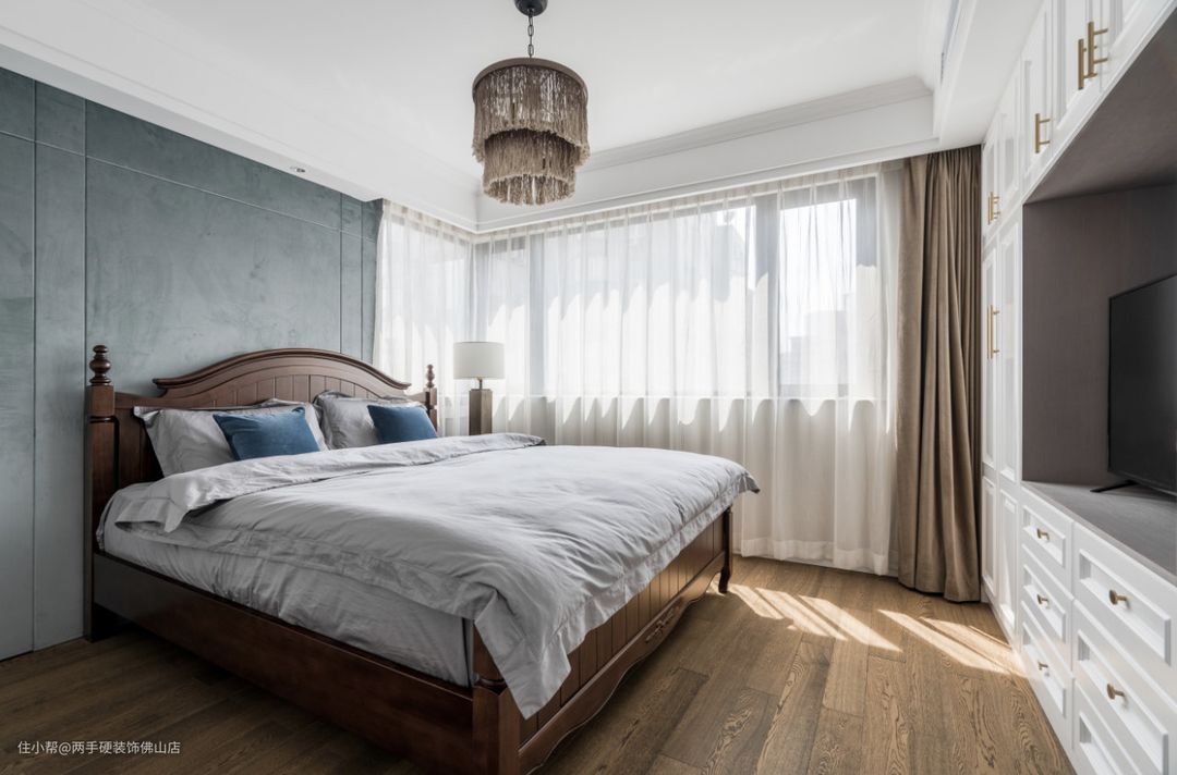 主卧在隐形门之后,空间不算很大 ,但有让人身心愉悦的宽幅窗,在这样的空间里,背景墙以饱和度很高的蓝绿色硬包,柜体门板全部为白色 整体舒适漂亮。