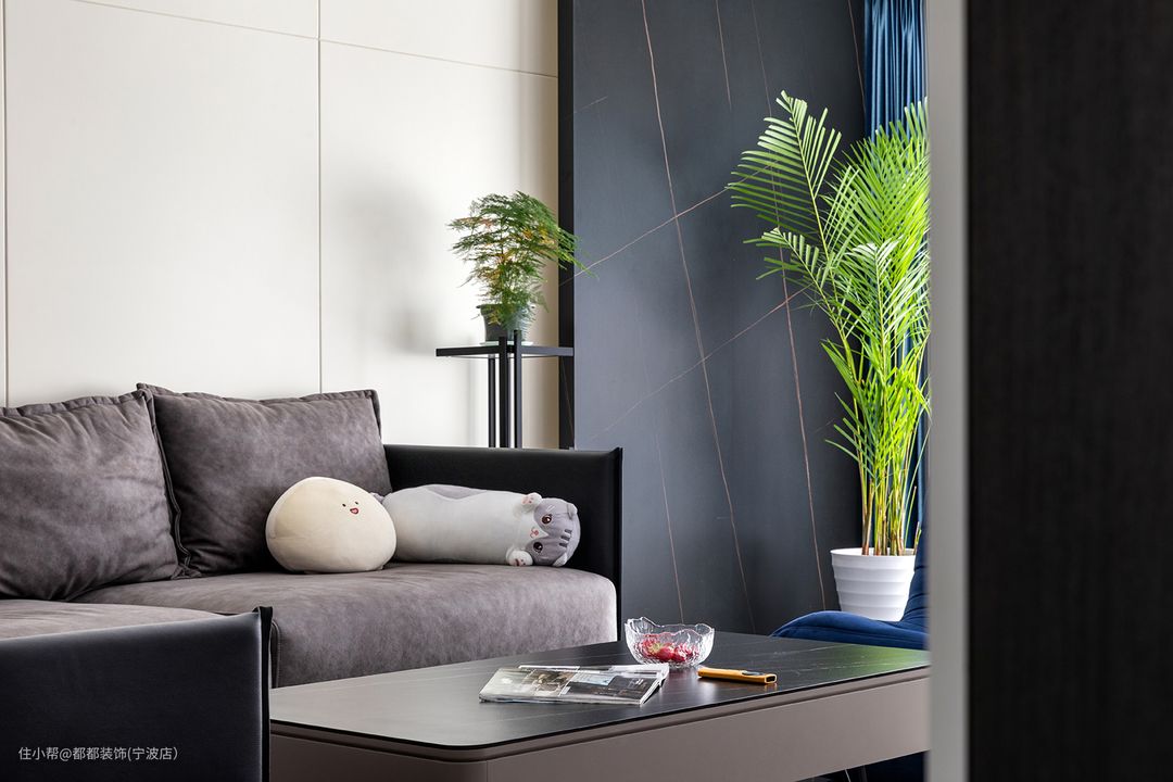 电视背景墙线条感十足,回字形设计整个空间视觉感受平整舒适,白色柜体配合着黑色格栅,经典cp永不过时,地柜采用了大理石材质,让电视背景墙的层次更分明,也使空间更有年轻和活力。