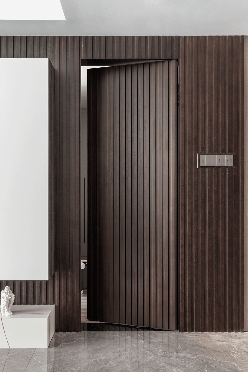 整体没有考虑设计主灯,而是在中央设置射灯,并搭配磁吸轨道灯、格栅灯,散光灯,格栅折叠灯等灯具,在做到点对点照明的同时,完美拉伸了整体视线,打造一种柔和温馨的氛围,也不会因为主灯的存在,从视觉上压低客厅层高的压抑感。