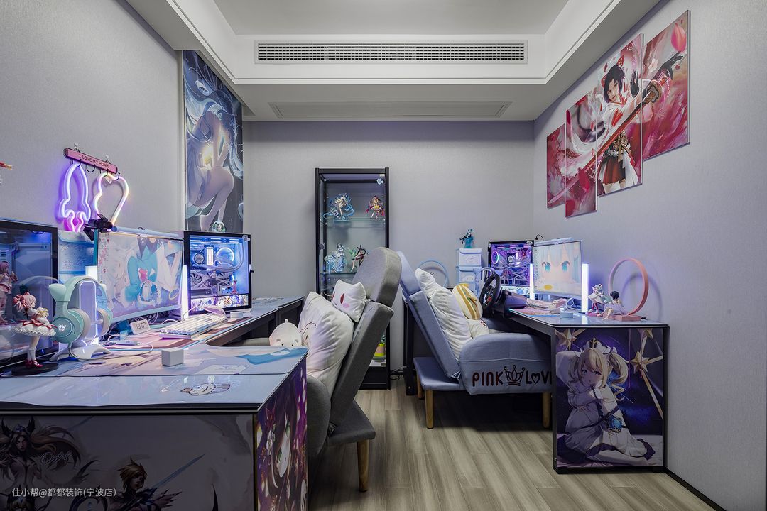 集游戏、展示、休息于一体电竞房你见过吗?将原本的书房设计成电竞房,是家中一处能完全放松的空间,空间以紫色系的风格为主色调,霓虹的灯光营造出科技感十足的氛围,墙上铺贴各种游戏角色海报,简直就是电竞爱好者的梦中情房!