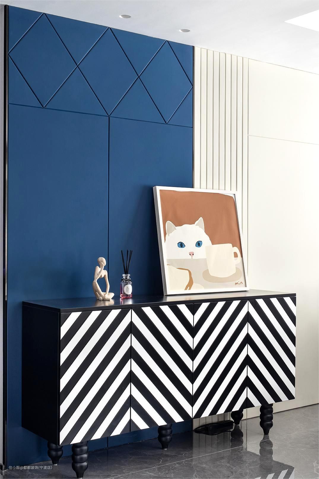 在蓝色背景下沙放置斑马纹边柜,莫兰迪橙的小猫装饰画和小人摆件点缀其中,整体构图和配色都十分讲究,各种物体几何轮廓多元、自由,打造摩登时尚的独特氛围。