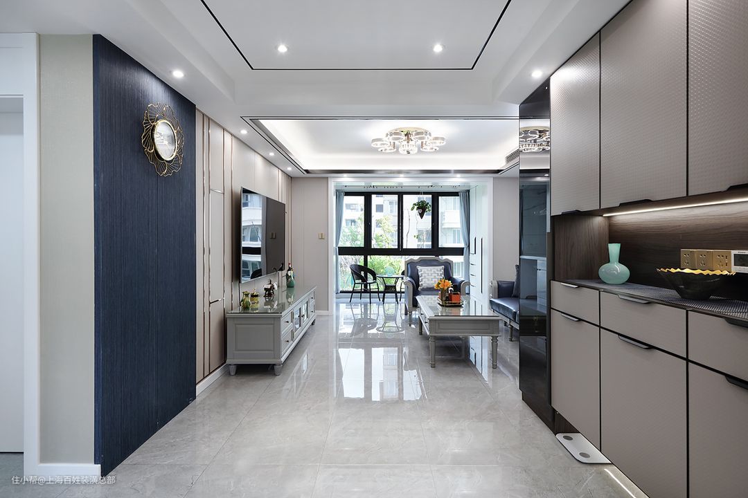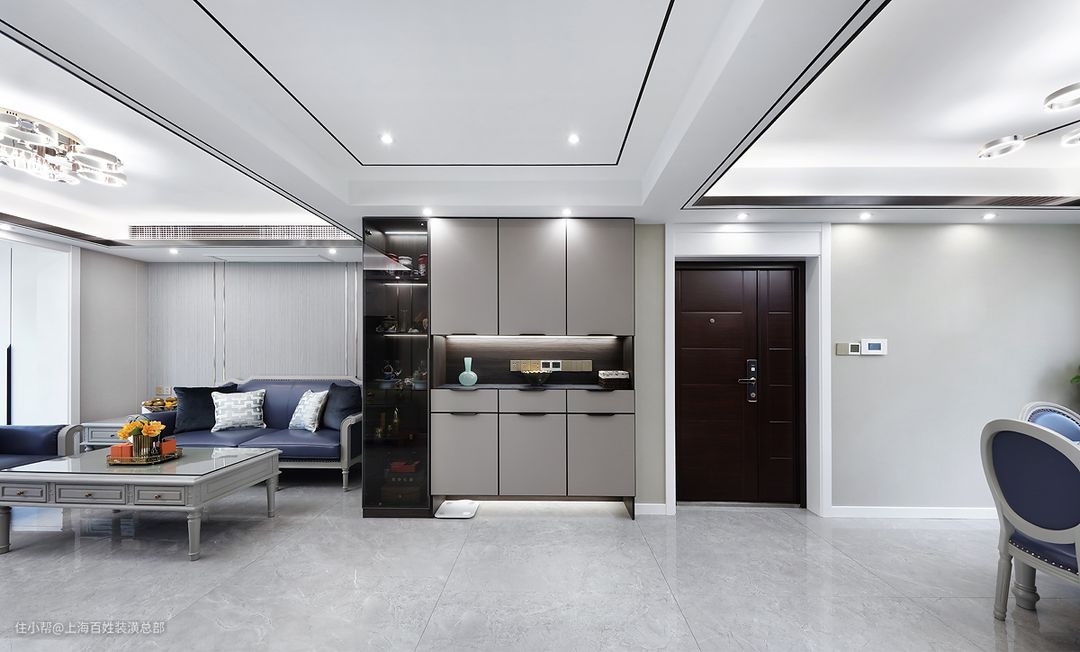 初入空间,第一眼就给人时尚、艺术、现代、轻奢的感觉。灰色的玄关柜,优雅的吊顶,无处不在的金属线条点缀,不动声色地展现出空间的精致和华丽