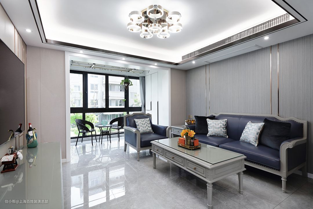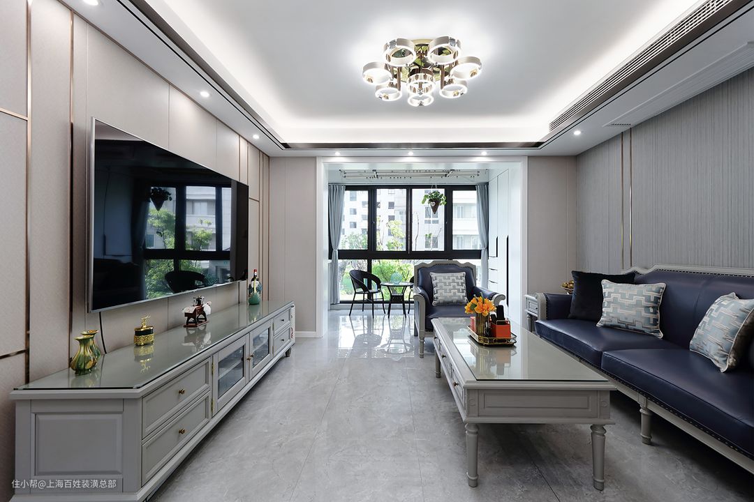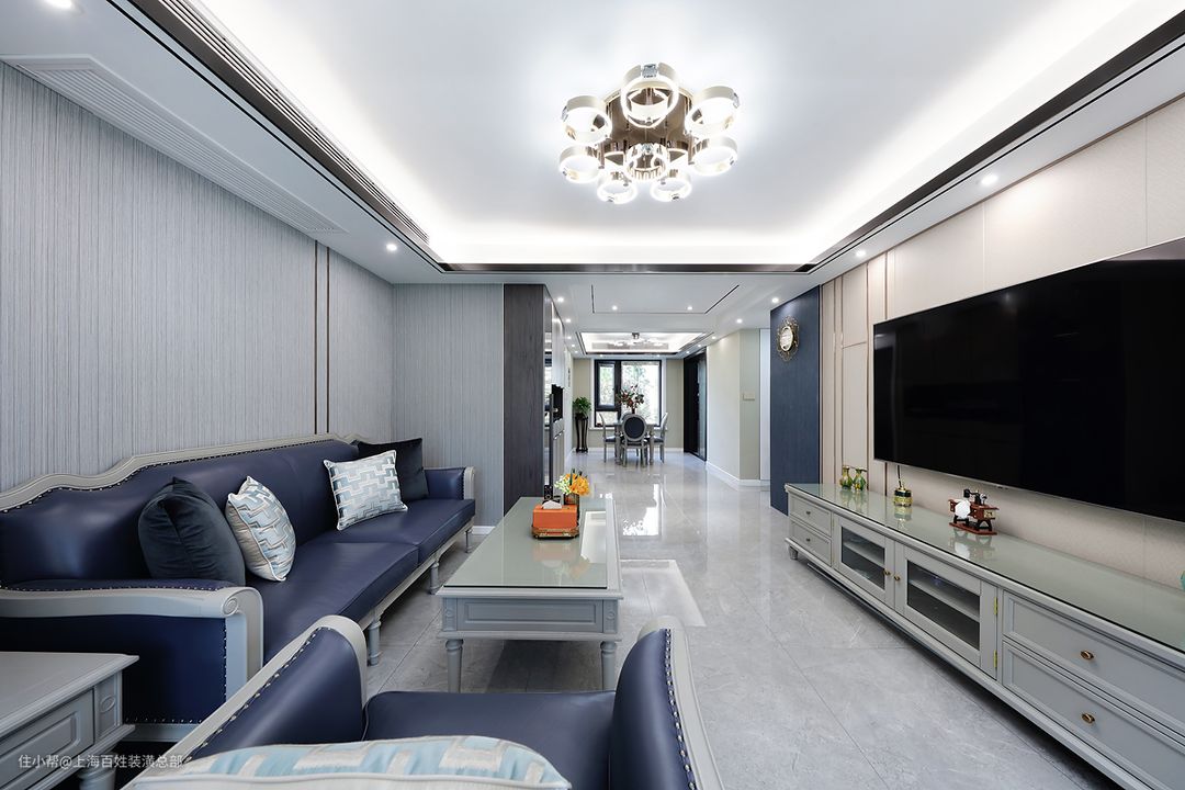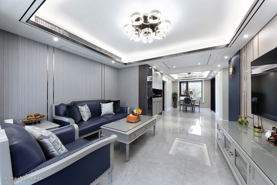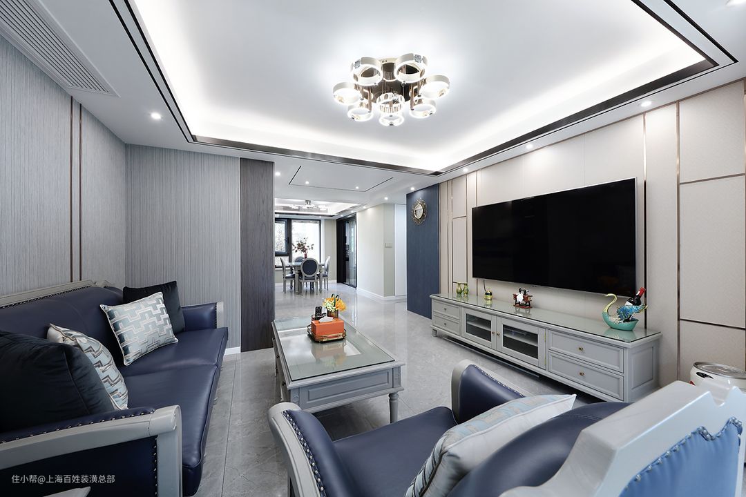 沙发背景墙、电视背景墙以及吊顶处,均采用了一些闪亮的金属元素,加上灯光渲染来打造轻奢气派。
