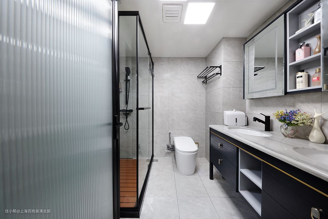 淋浴区采用通透大气的玻璃相隔。黑色玻璃门边框,黑色台盆柜,让空间在柔和中平添了几分冷峻感。
