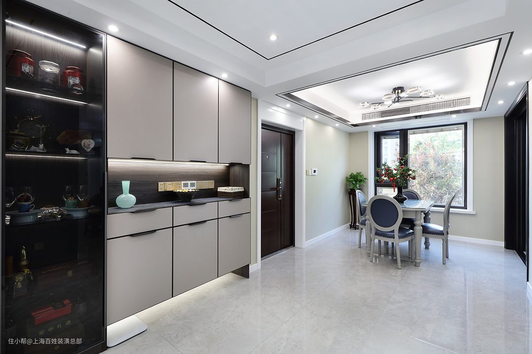 进门处玄关柜,与独特的吊顶,把宽阔的空间分割成客厅、餐厅两部分。