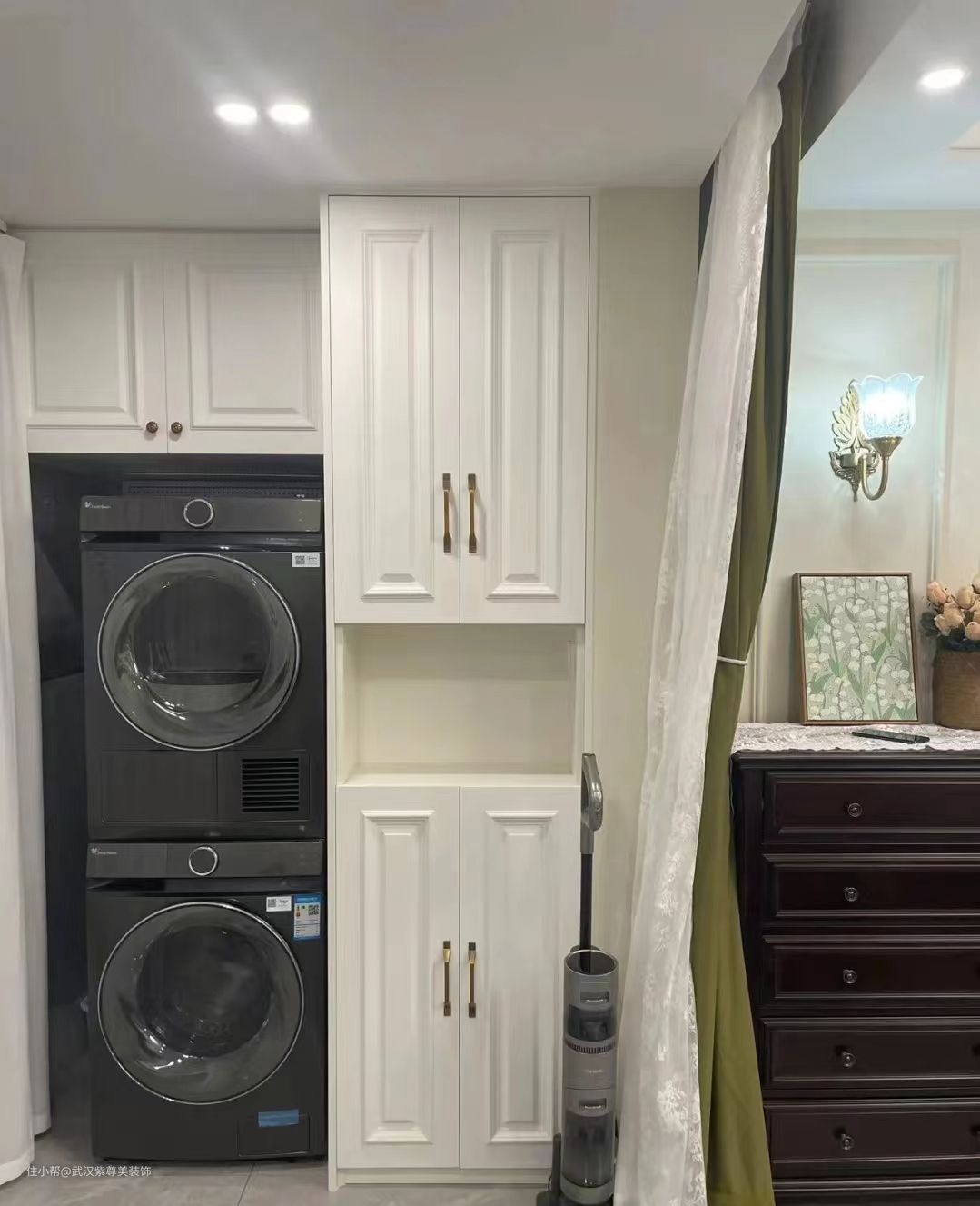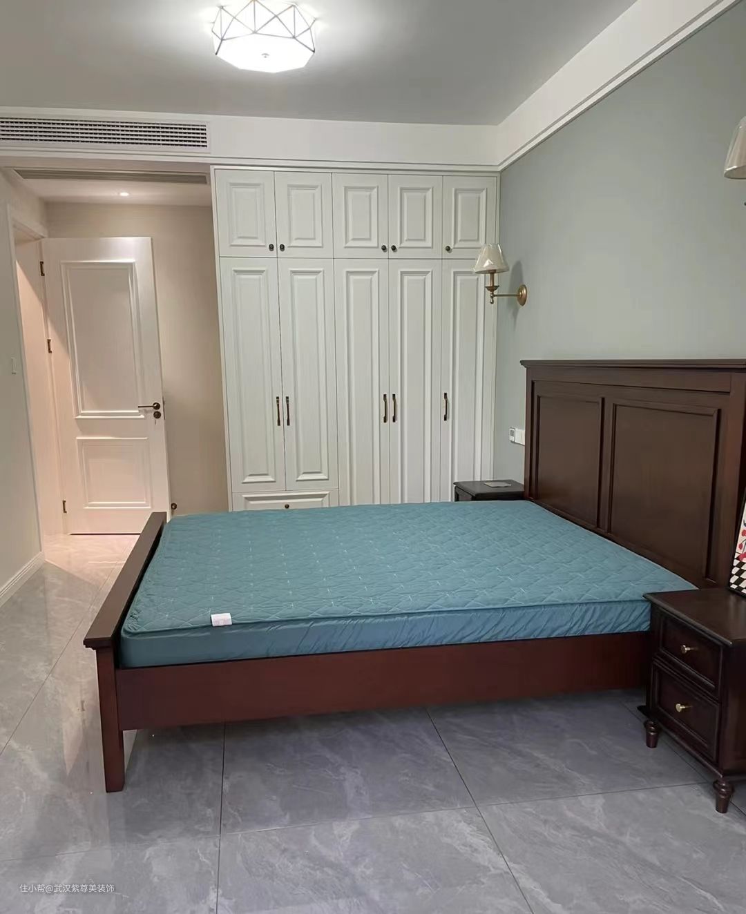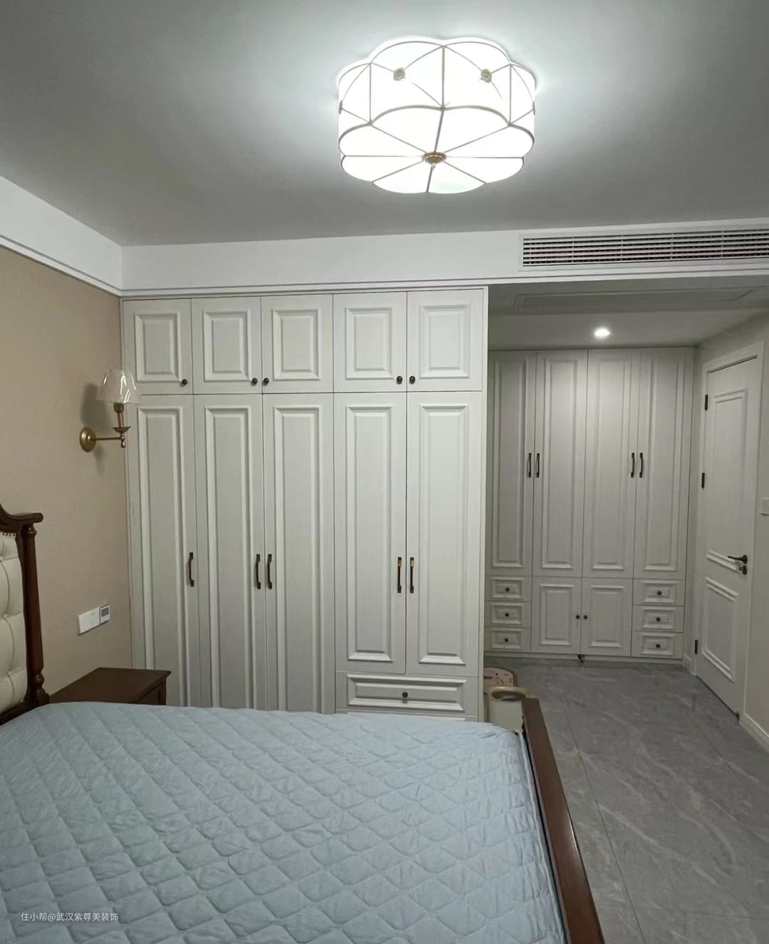进门旁和床侧面都坐了整面的柜子,增加收纳,颜值与实用并存!