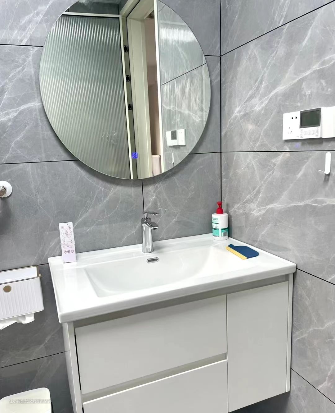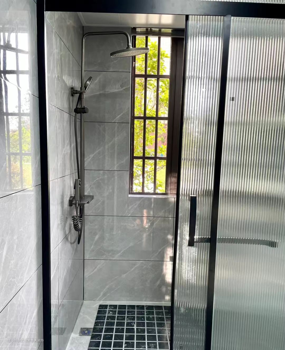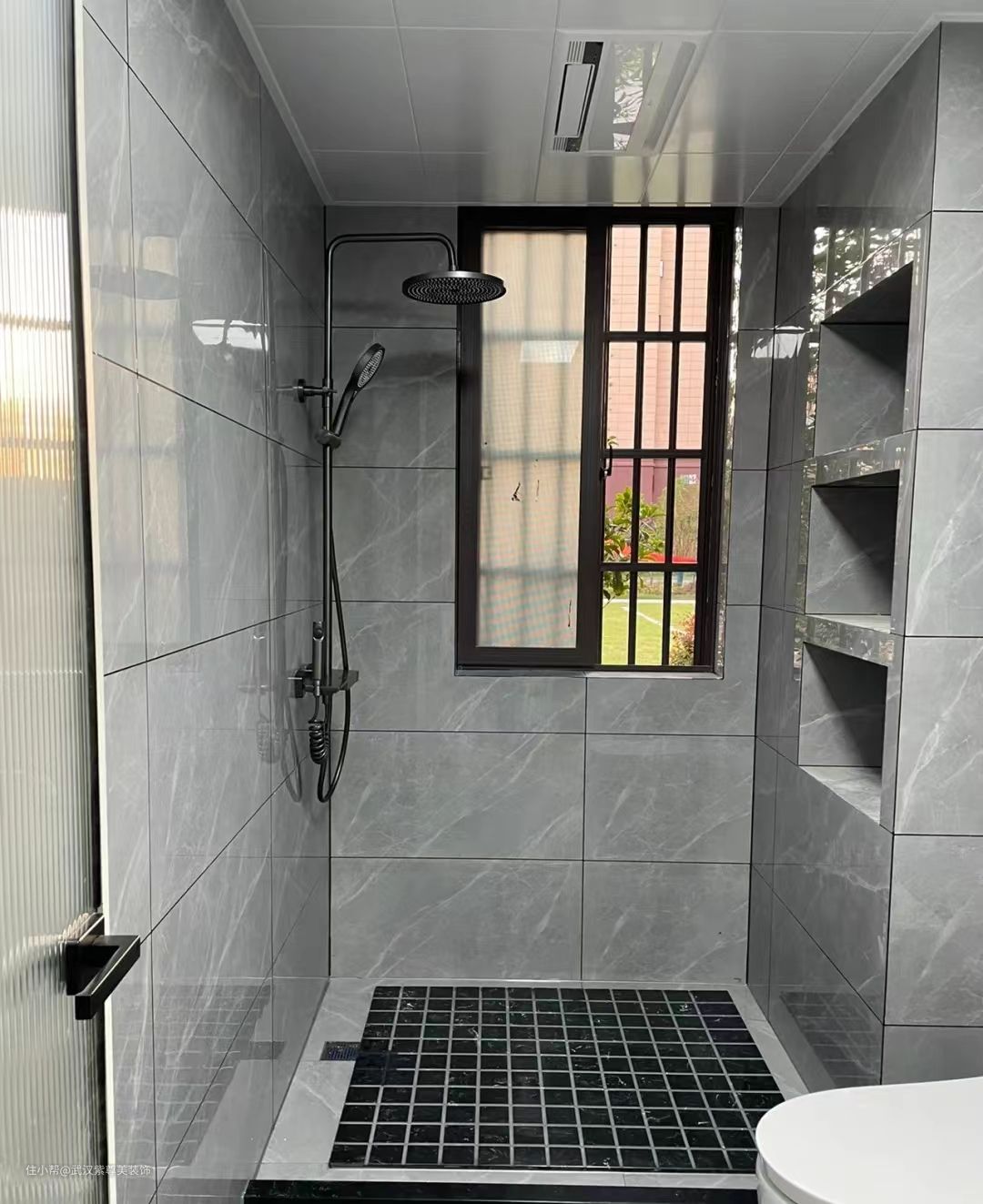 卫生间干湿分离,利用长虹玻璃隔断,透光不透人,因为楼层很低,这样也不会影响洗手池这边的采光,淋浴区做了拉槽增加排水的速度,同时还设计了壁龛放置洗漱用品。