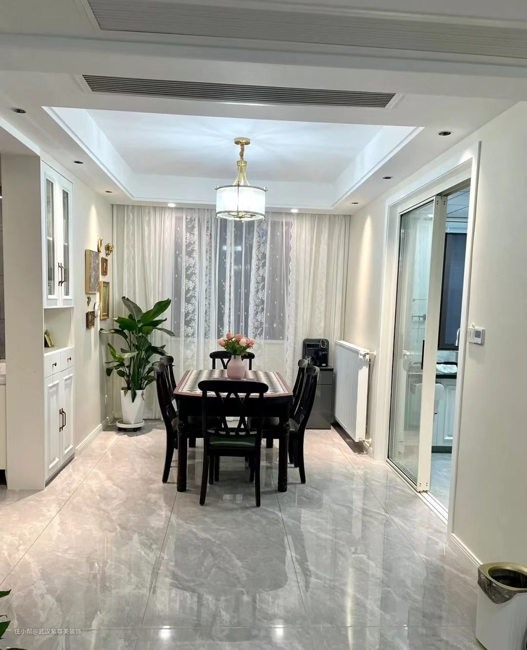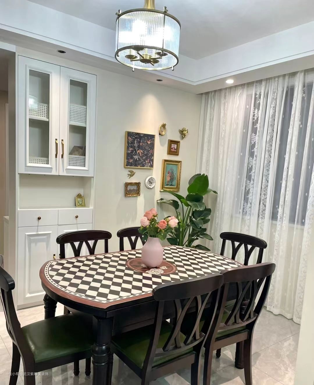 餐厅打造的定制酒柜储物柜,整体配色和家具形成鲜明的颜色反差,配合精致的琉璃灯具,挂画,五彩的花艺,让您感受在花园闻着花香享受美食的快乐。整体空间百色系,温馨暖意;