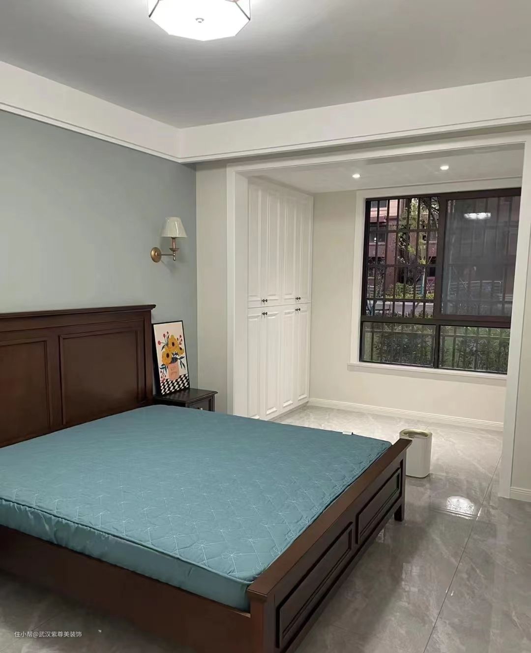 这是次卧,同样做了整面的衣柜增加收纳,背景墙则是比较清冷的色系,伦敦雾,简单的双眼皮预留了窗帘盒。