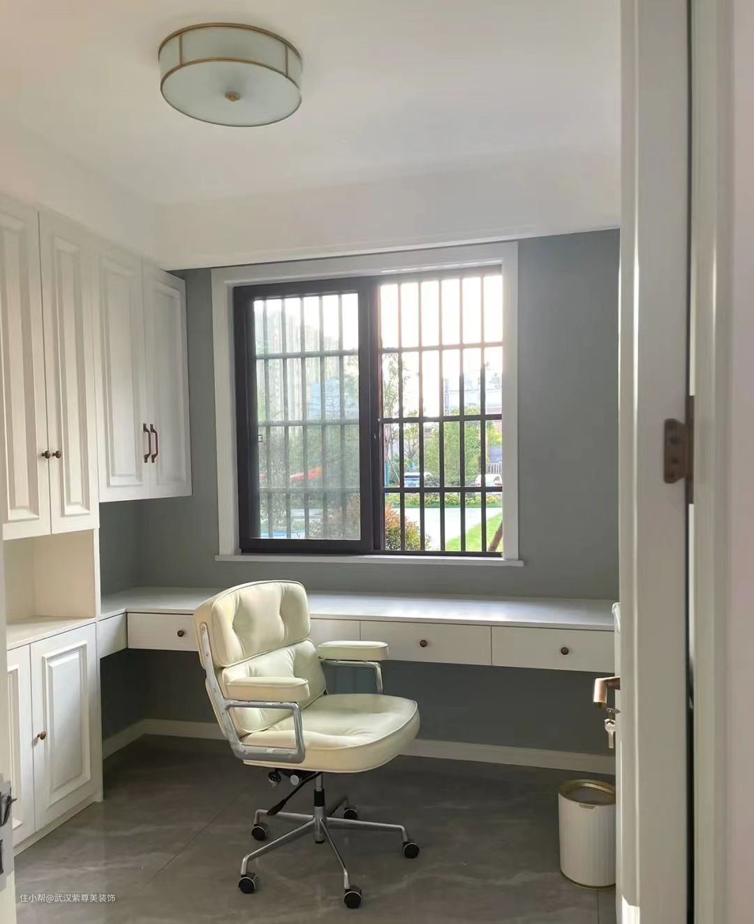 书房一侧做了整面的收纳柜,靠窗设计双人书桌,可以学习也可以办公