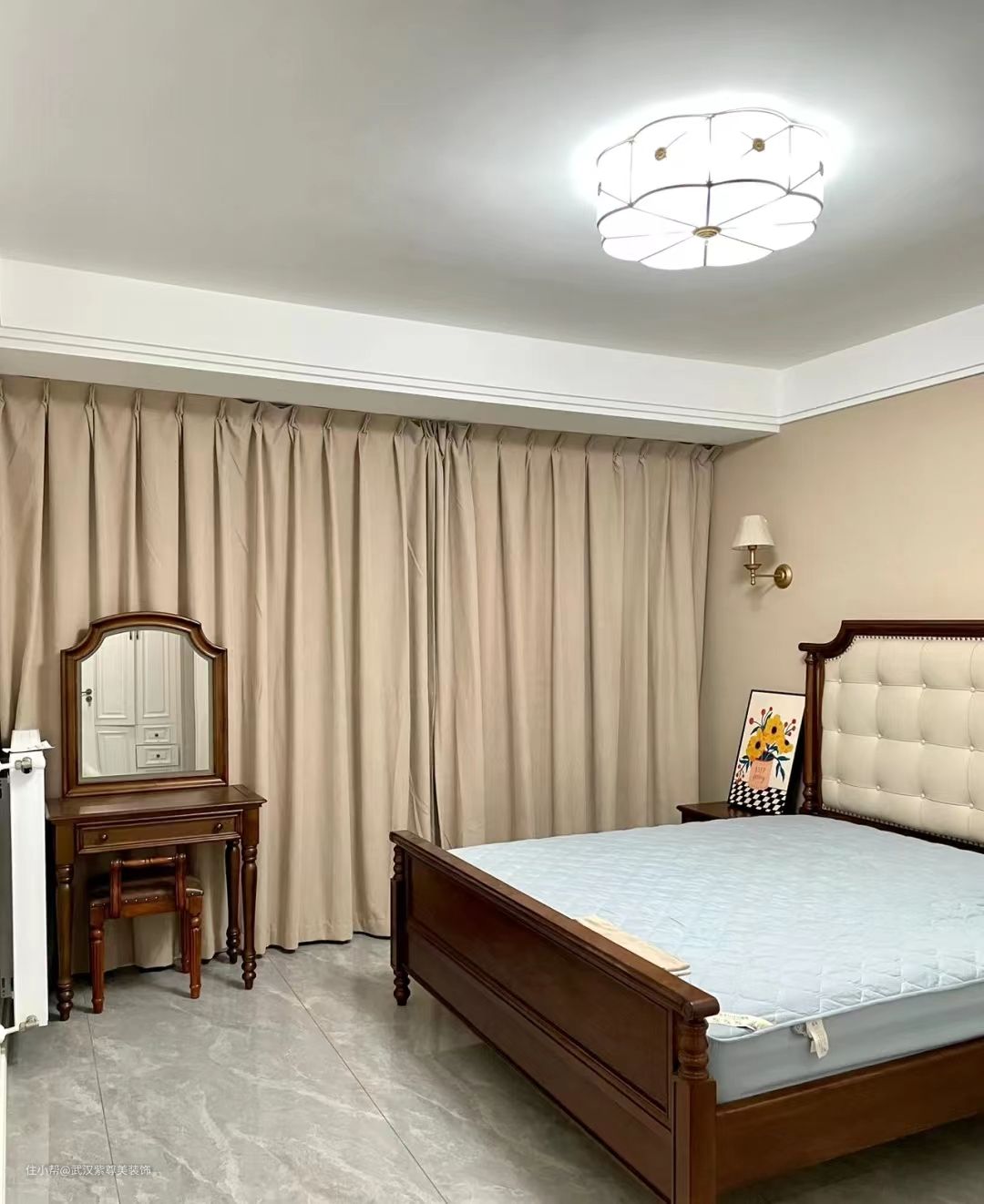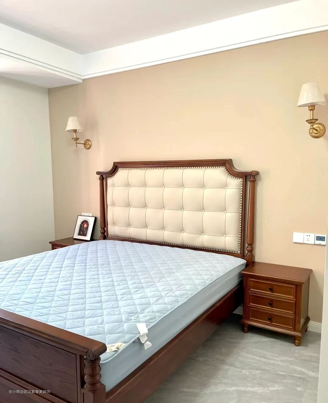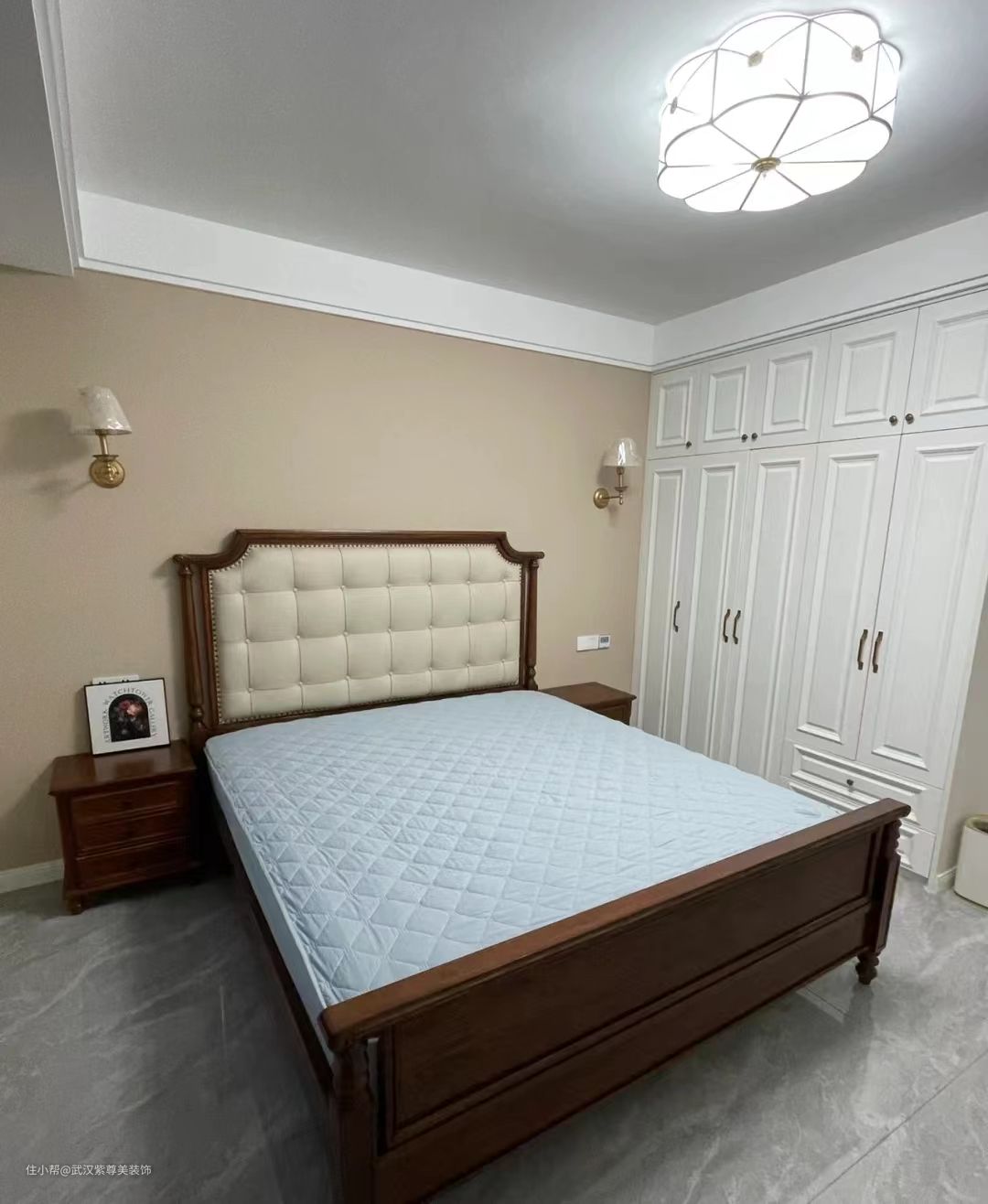 主卧床头背景墙选择了奶咖色,打破空间的单调性,搭配简洁但不失质感的灯具,整个空间镀上一层暖意