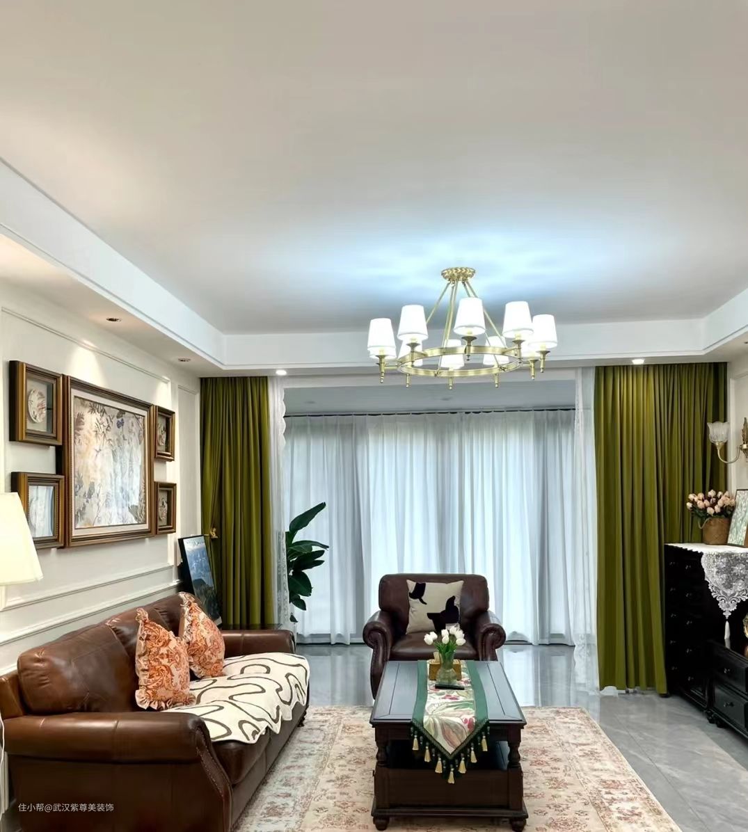 沙发背景墙用石膏线条设计简单的造型,凸显层次感,还有美式古典韵味的装饰画,古典的壁灯,美式皮质家具都凸显精致典雅的生活方式。