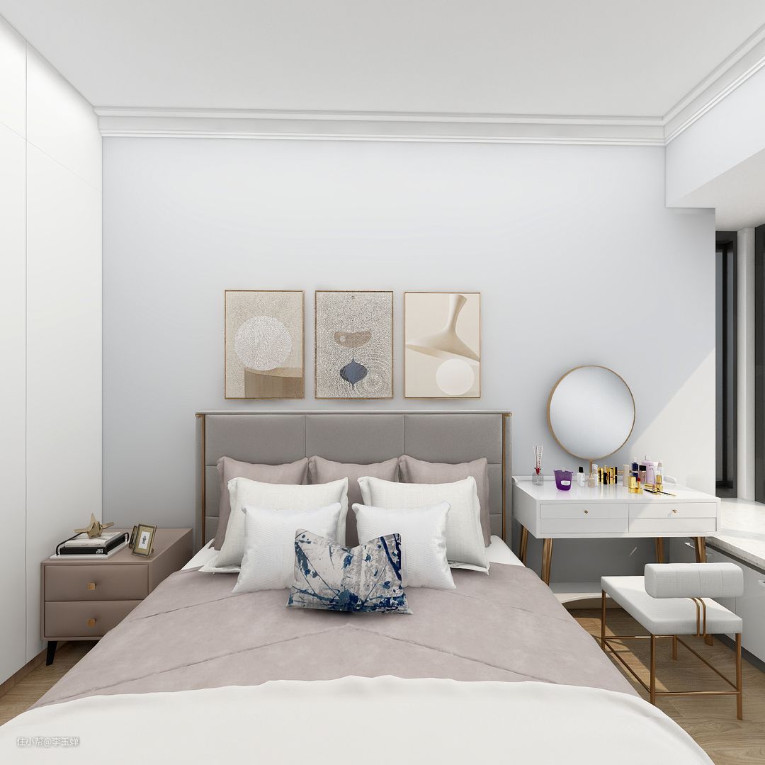 主卧在简约的基础上增加了一些具有女性特质的温柔点缀,整体色彩倾向更加暖和柔和。