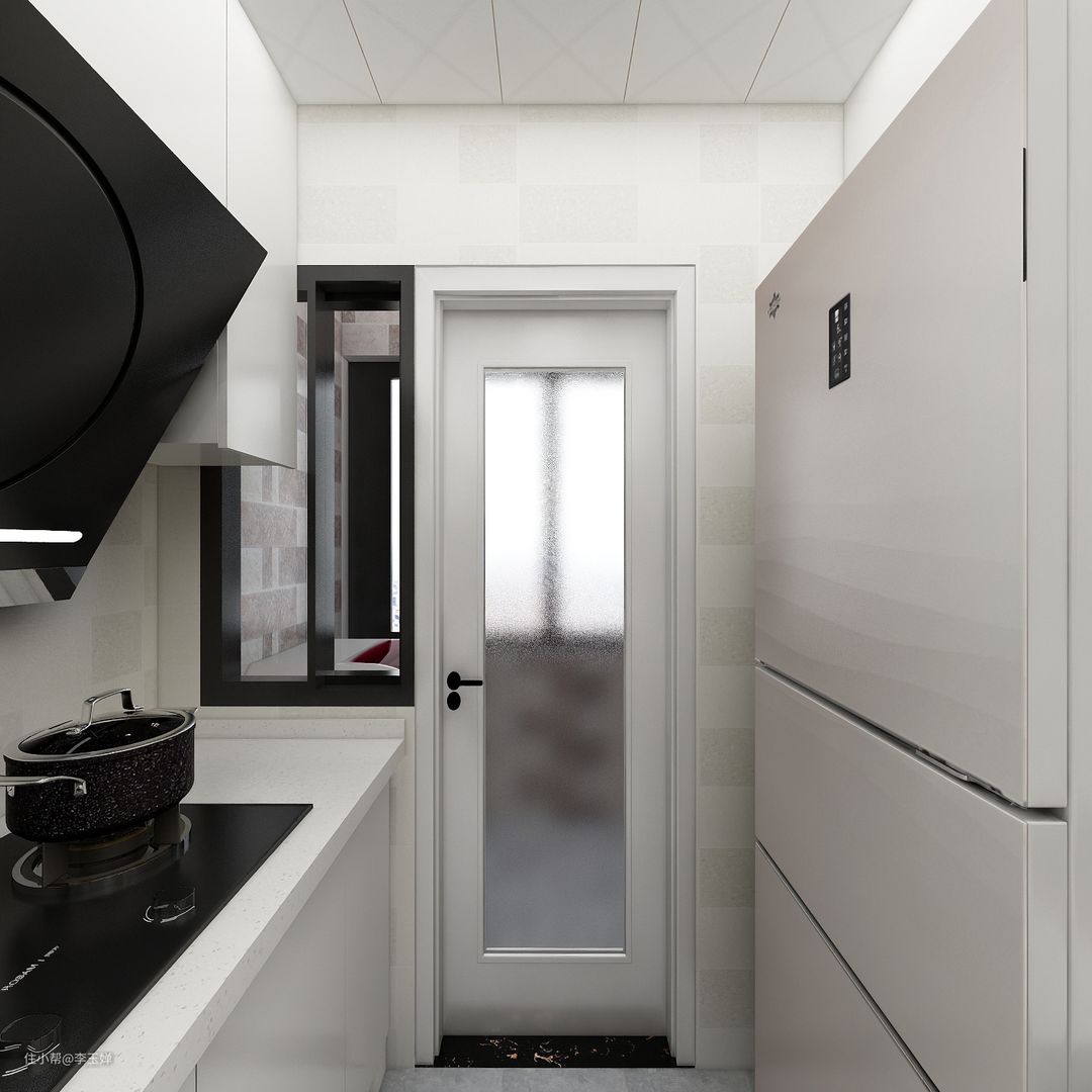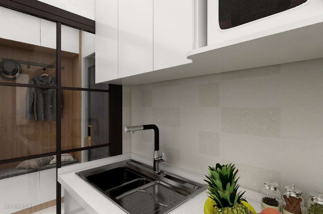 厨房在入户门的左侧,原来的墙壁显得比较压抑,所以直接用玻璃推拉门替代,黑色的格子框架增加了一点存在感。