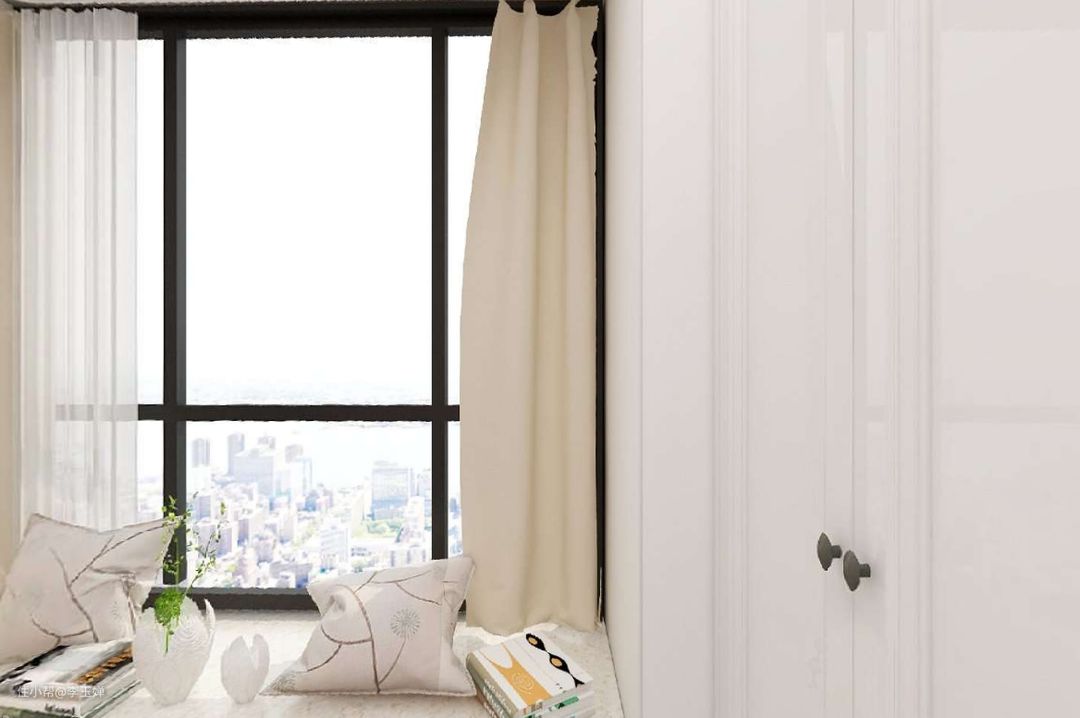 保留飘窗,在上层安一块简单的奶白色大理石板,放两个小靠垫,孩子看书娱乐,或者吃零食都能使用。
