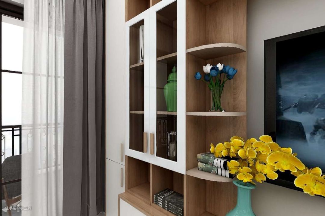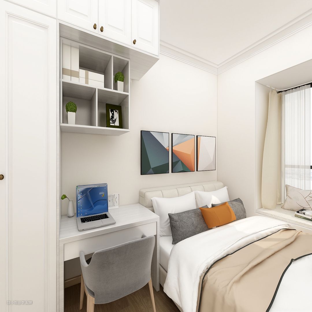 省去床头柜,用单人书桌替代,使用面积增大, 上方还有开放的收纳柜,放一些书籍和盆栽,也能作为点缀。
