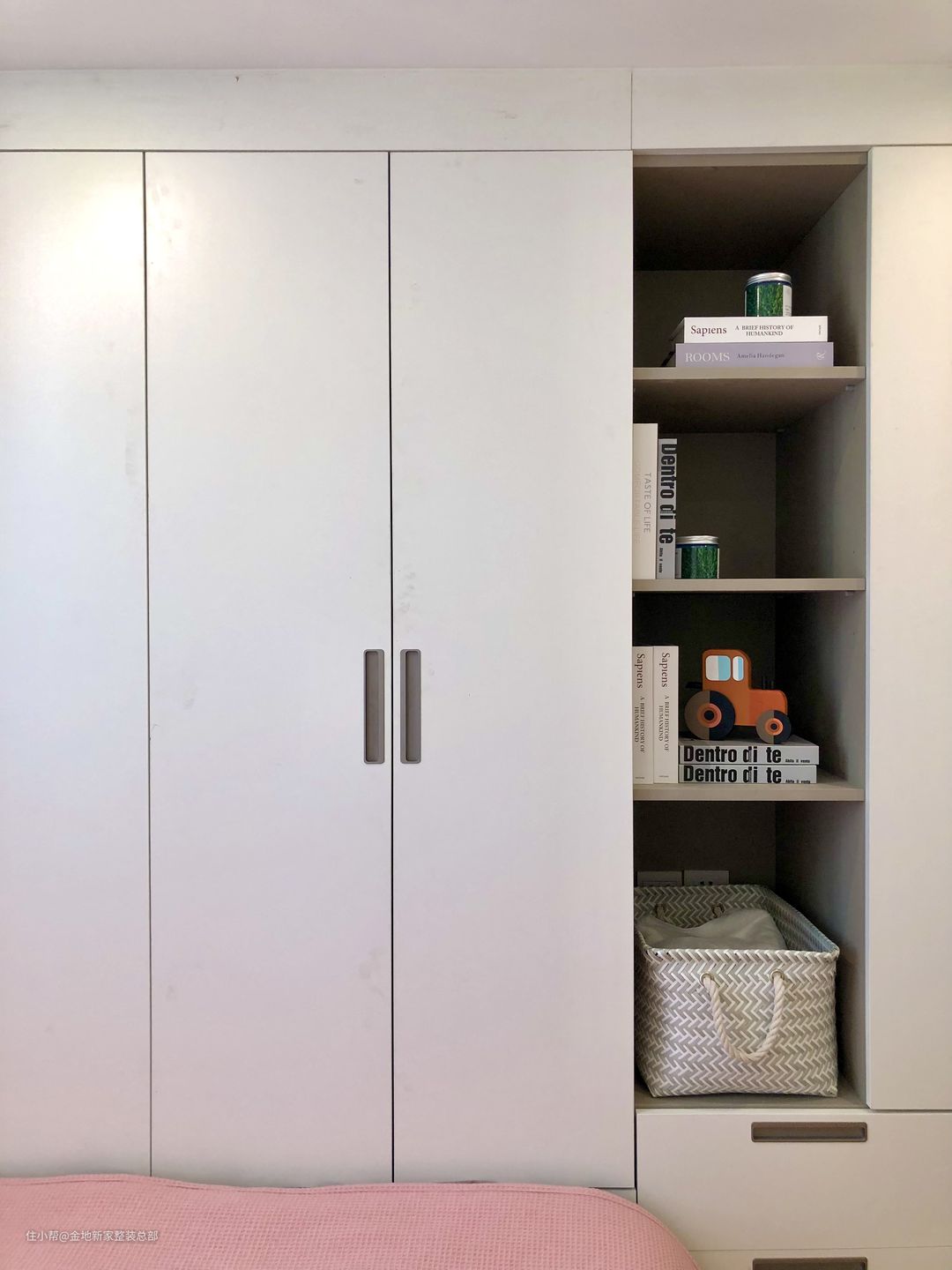 二楼的暗格有一个承重的横梁挡着,层高非常矮,一直没有利用起来,设计师在整个房屋的设计中考虑到了实用性,建议采用全柜体的设计,这样业主在平时的时候可以将不常用的东西放到这里就可以啦~