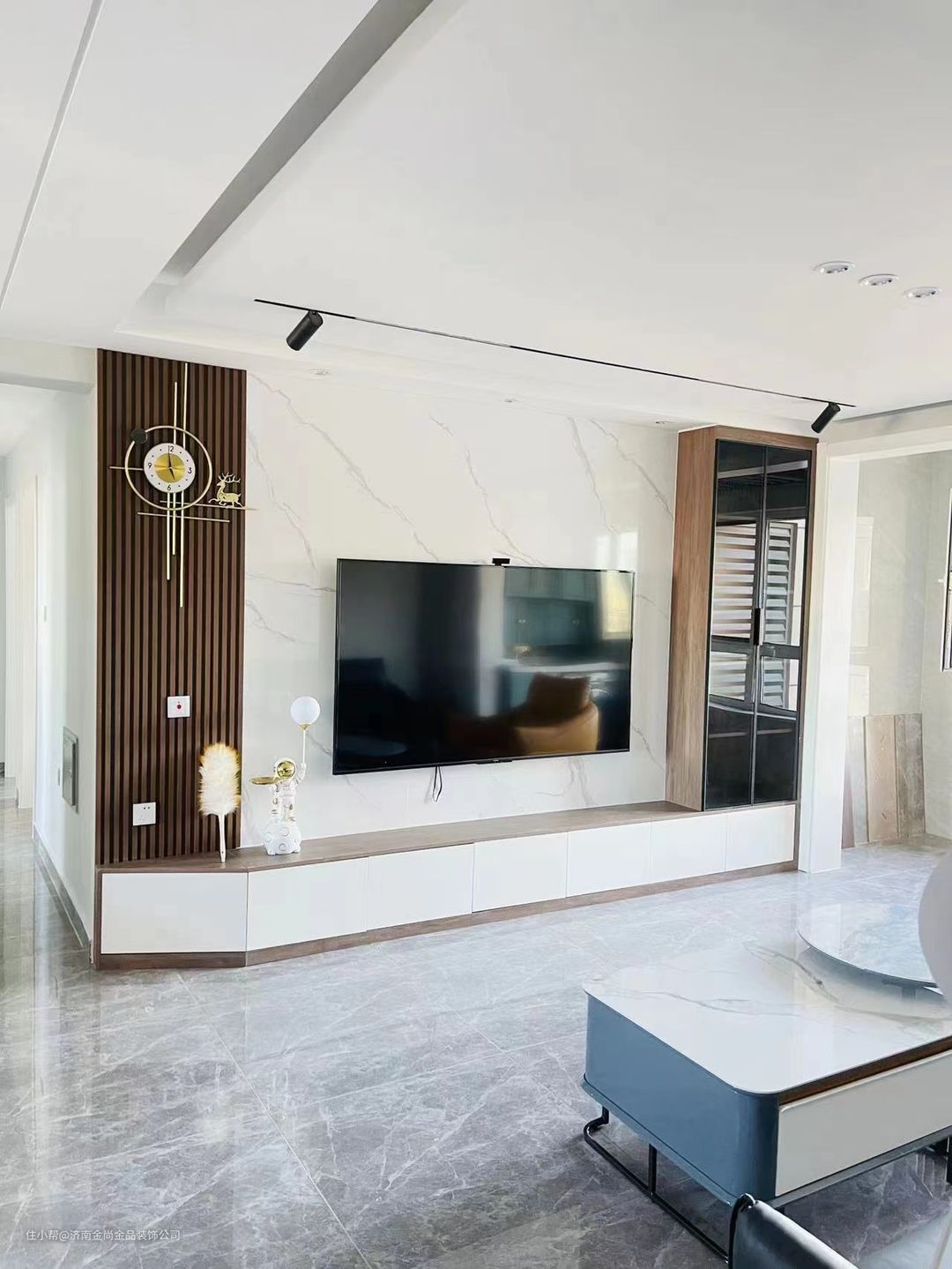 整屋客厅无主灯设计,加射灯,影视墙材质是大理石加实木线条 增加了挺多收纳