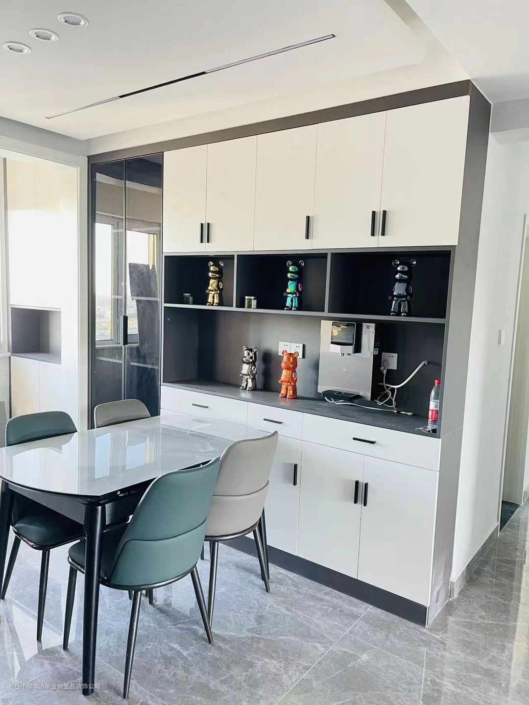 整个餐厅做了一年面收纳柜,业主比较喜欢暴力熊摆件,单独设计了几个空间摆设位置,柜子的话是品牌欧派生态板