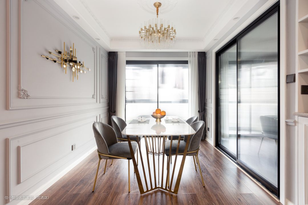 餐厨空间通透明亮 白色墙面勾勒雕花线条 并以金色饰物点缀 餐厅白色的餐桌搭配浅灰色餐椅 古铜色的金属镶边 高级中多出一分神秘感