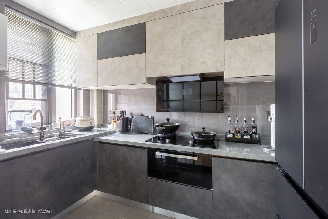 厨房的色调均采用灰色 仿岩板的饰面 给空间增添高级感 吊柜采用拼色 使空间产生丰富的视觉层次感