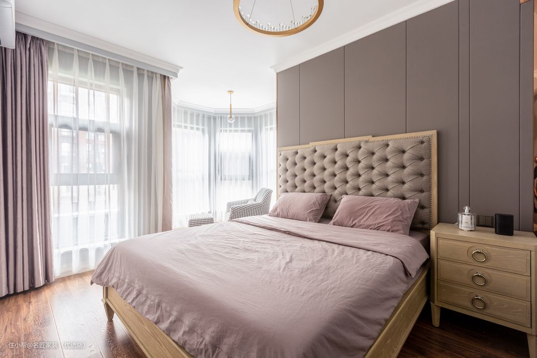 主卧整体自然沉稳 背景墙采用了深灰色硬包 凸显高级感 搭配温润的胡桃木 传递生活的温度 粉色的窗帘床品的搭配 让卧室充满浪漫的情调