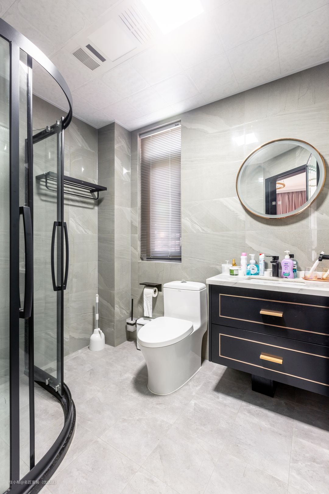 卫浴间采用干湿分离 灰色通透的空间 设计了定制黑色浴室柜 玫瑰金五金配件点缀 整体色调稳重 彰显低调奢华