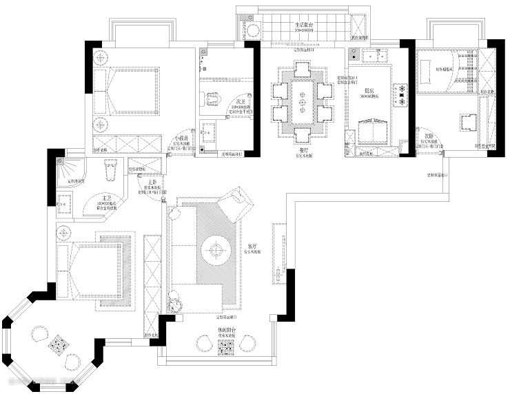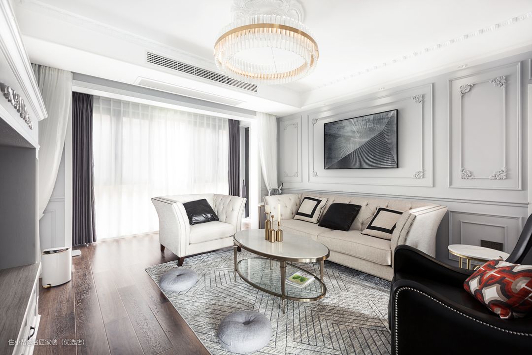 以白色为主色调 纯净柔和 背景墙、石膏线上的雕花装饰 精致复古的水晶吊灯 增加法式的浪漫 米色布艺沙发和黑色皮质沙发的共舞 构成空间充满张力的对话 沙发后的黑白背景装饰画 宛如现代与上世纪初巴黎艺术风格在此邂逅