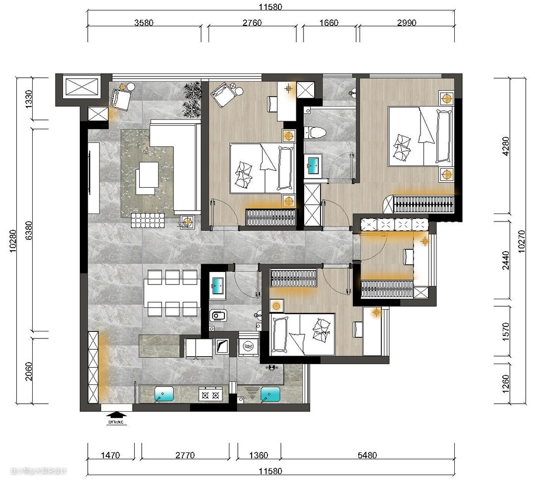 本案为套内115平米的4房户型,房子是女儿给父母买的,一家三口居住,他们都在机场工作,平时上班都很忙,客户觉得原始户型的阳台很大,卧室比较小,厨房的空间也很零碎,客厅不够宽敞明亮,而且储物空间也不够。正因为平时上班很忙,所以更加珍惜家人在一起聚餐的时光,所以客户想把整个厨房做得更加宽敞明亮一些,通过沟通,决定做开放式厨房和吧台的一体化设计,与客厅空间融为一体,女儿的卧室扩大,留有独立的办公空间,再通过后期的软装设计搭配,给客户营造一个宽敞明亮、简洁时尚的家。