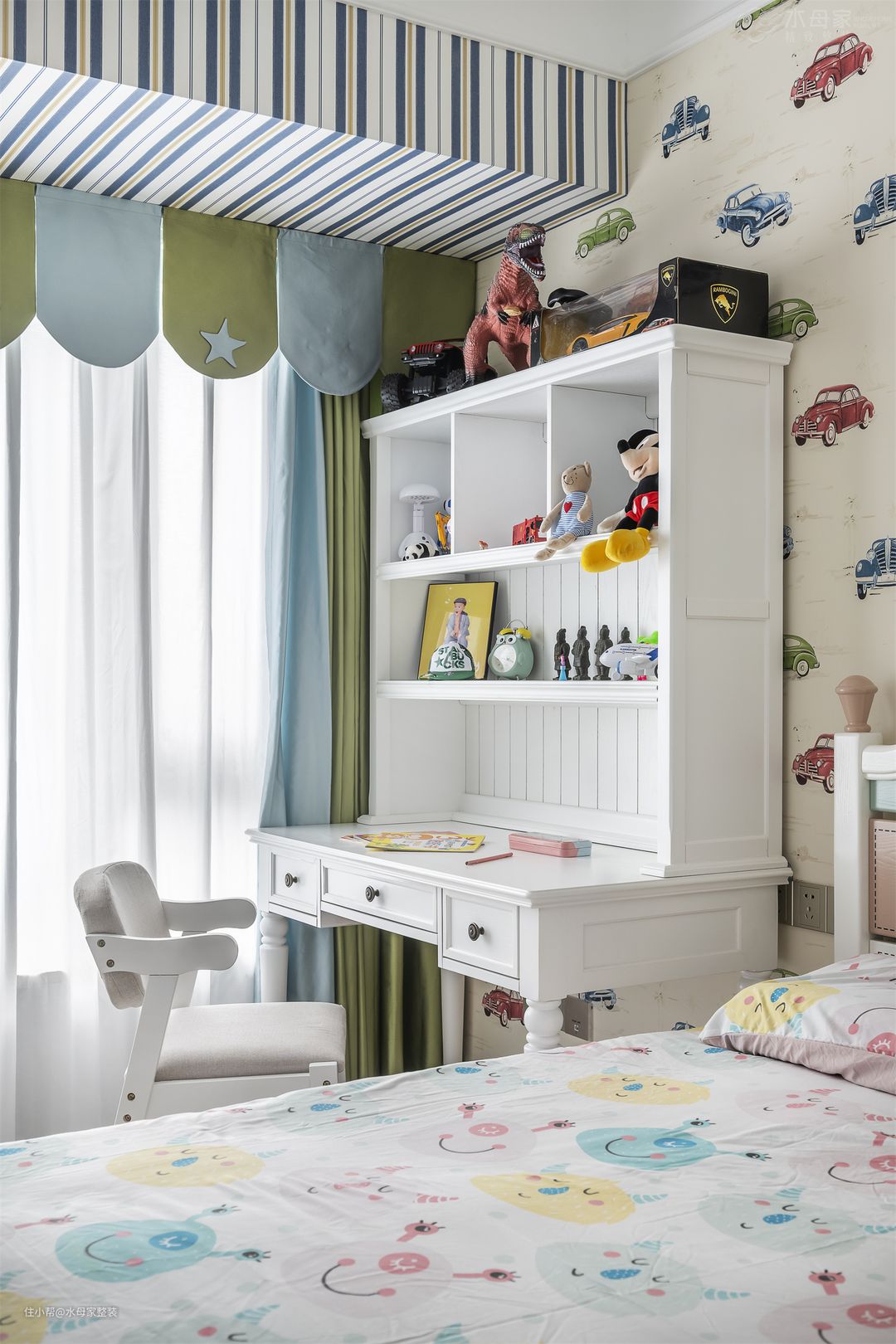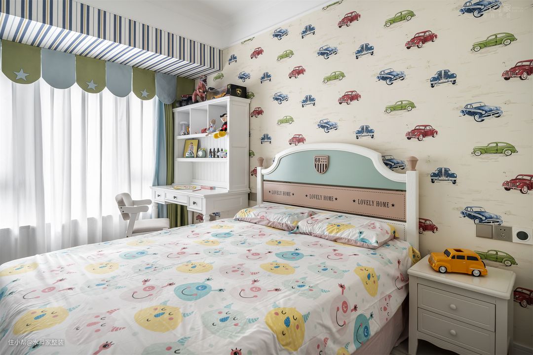 业主儿子很喜欢小汽车,应业主要求,在背景墙上铺了整面墙的小汽车,获得了小业主的十分满意。
